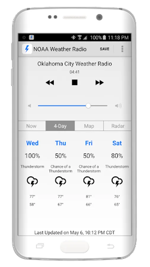 In addition NOAA Weather Radio can ALERT you to potentially life threatening weather via audible push notifications directly to your device 24/7 even if your not currently using the application and your device is asleep and locked. Also you will be able to retrieve the current conditions along with a detailed 4 day forecast for the weather station your listening to or you can get current conditions along with a detailed 4 day forecast based on your current location via GPS or Wifi. This is an amazing application and is available at the fraction of the cost of a real weather radio!