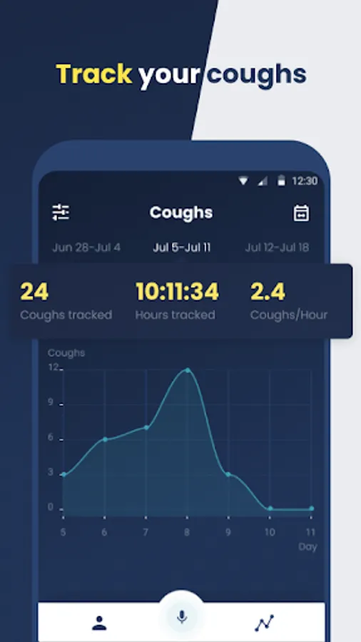 Here's how it works: CoughTracker identifies the explosive sounds that might be coughs. Then these sounds are analyzed and, once confirmed as coughs, they are recorded on your own dashboard. You can see how many times you cough and when your cough is occurring. When the app is running, the app records a very short sample – a half second or so -- every time there is a cough-like sound. The sample is too short to contain any contextual information, but long enough to determine if you have coughed.