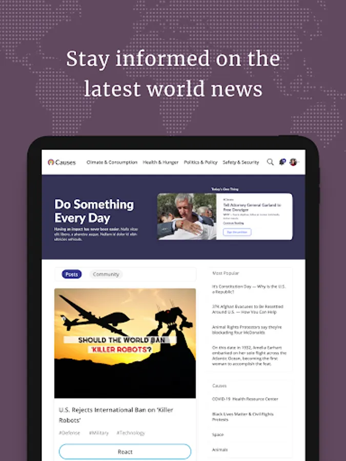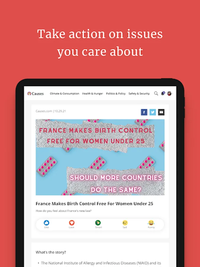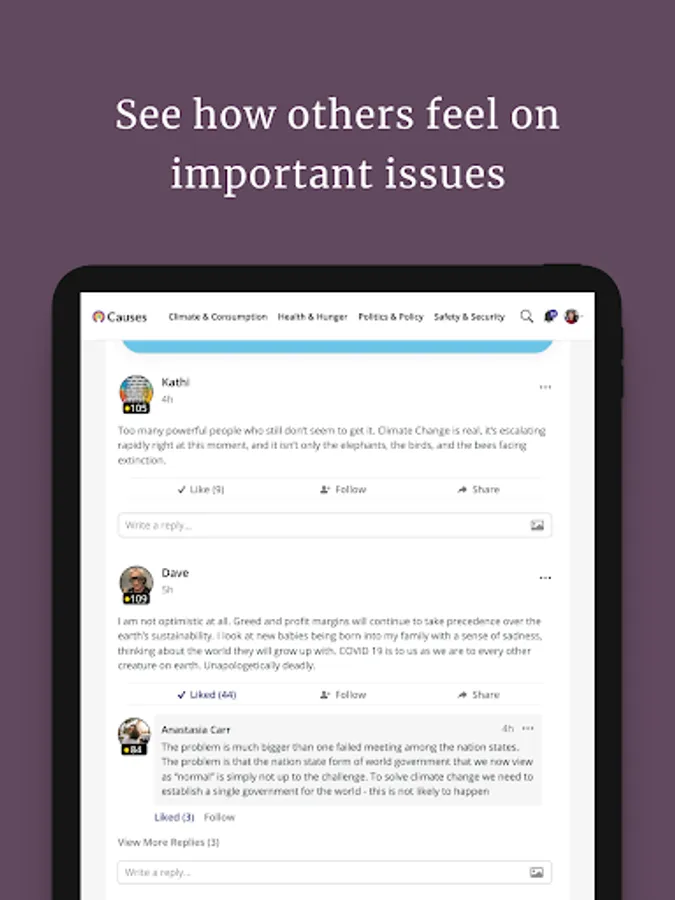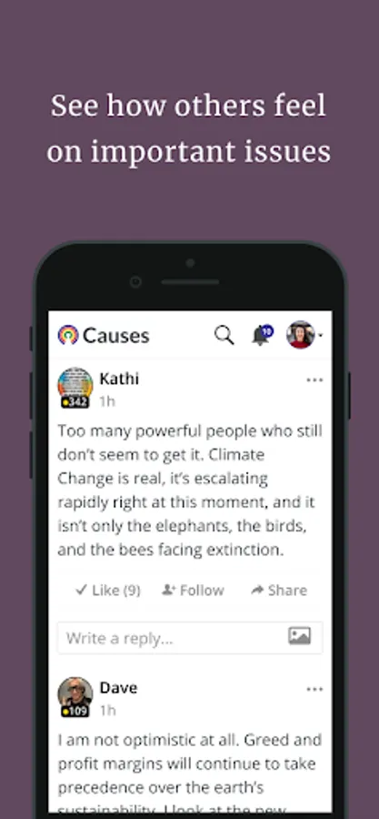 Causes makes it quick and easy to understand the issues impacting your world—and streamlines the process of telling decision-makers how to earn your vote and your business. Or create your own Cause and galvanize your community into taking action on the topics you care about most.