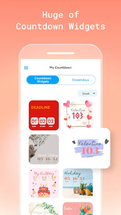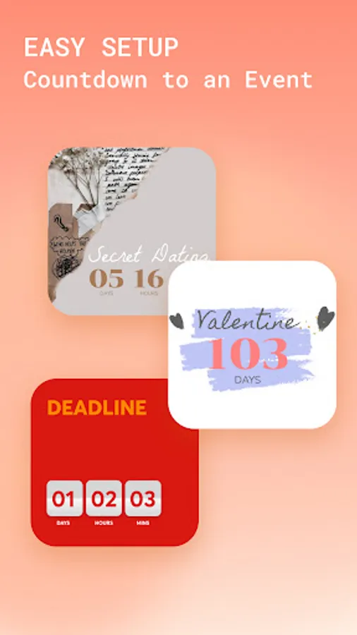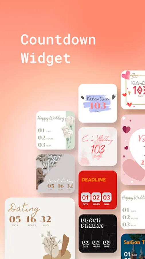 Countdown Widget allows adding countdown widget to remind and manage time, accurate to the second. With this feature, you can set event reminders such as holidays, birthdays, anniversaries, parties, Thanksgiving, Christmas, Halloween, Valentine's Day, exams, goals, etc.