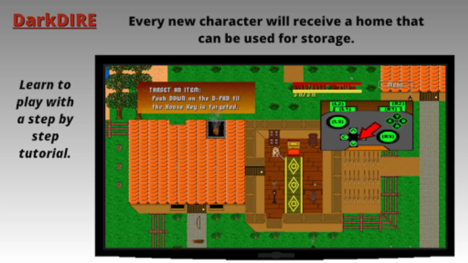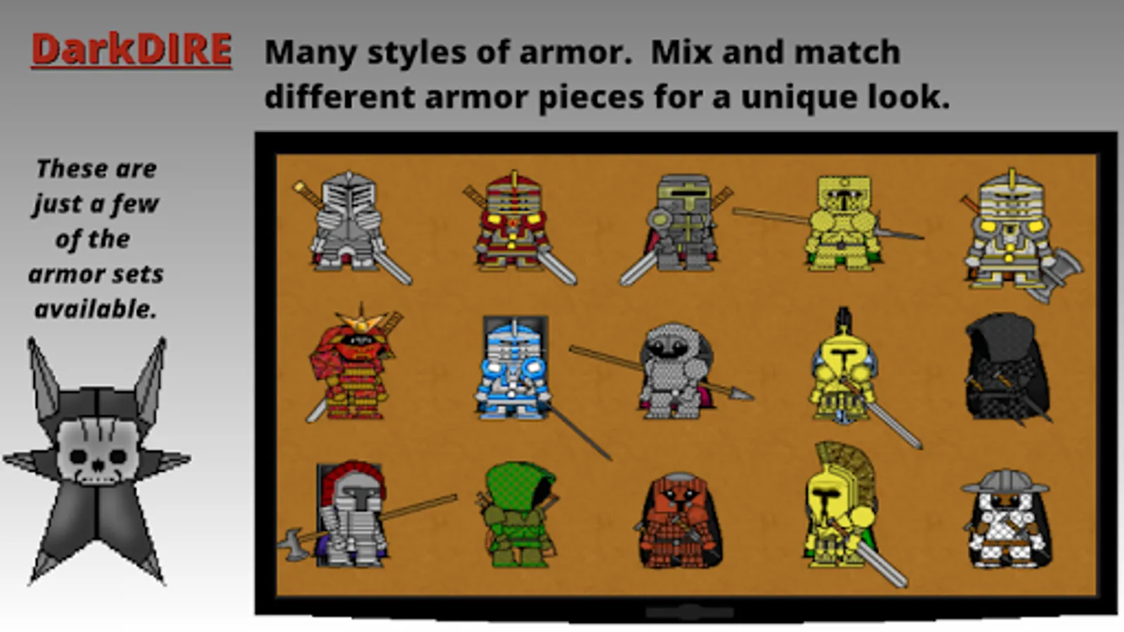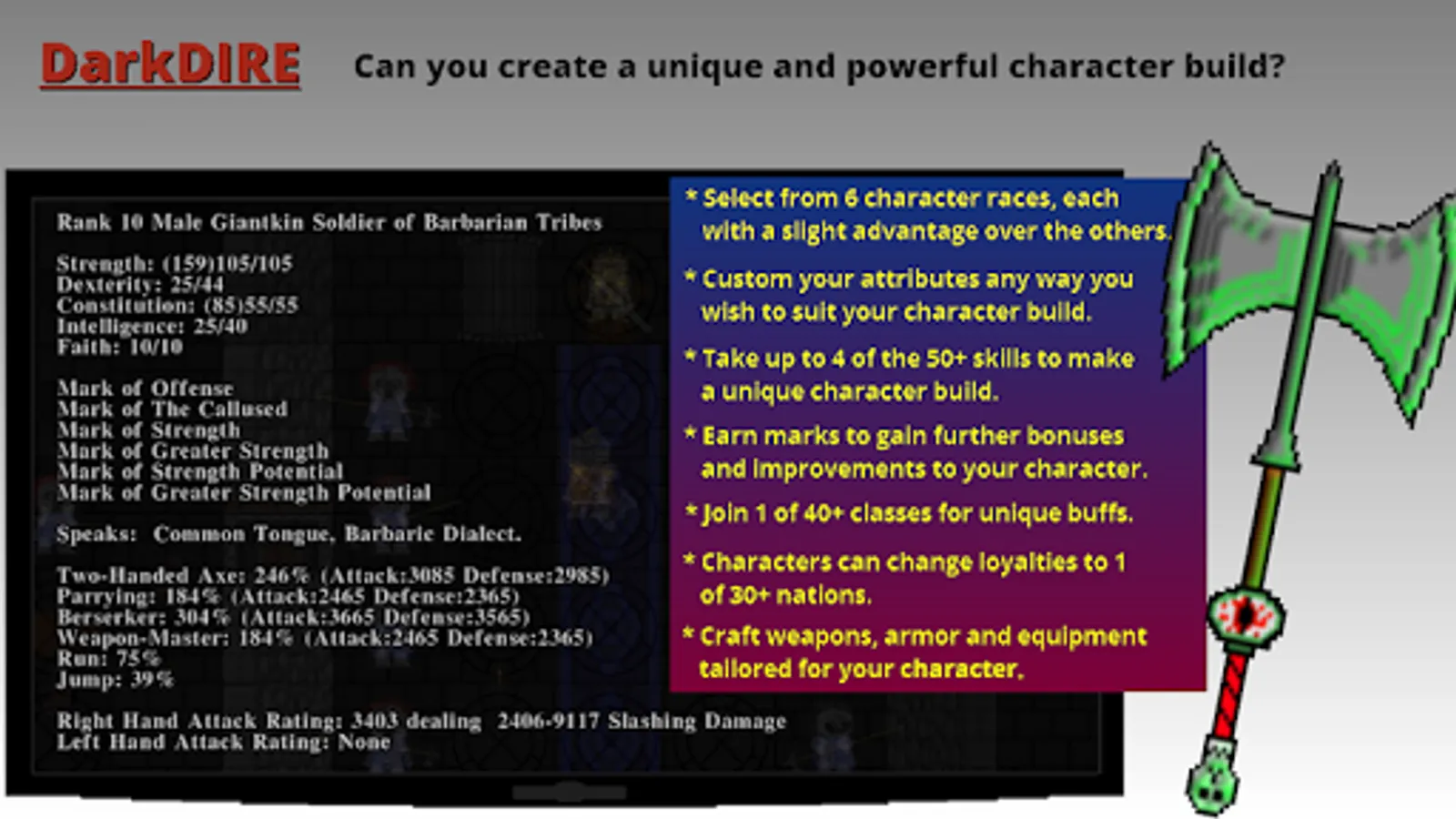 Inspired by old-school rogue-like and RPGs, DarkDIRE uses simple graphics/animation to build a living world. Explore endless procedurally generated kingdoms and dungeons. Gain loot by raiding enemy kingdoms. Sell it to become rich and powerful. Maybe even powerful enough to rule your own kingdom.