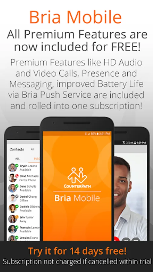 • Thoughtfully innovated, with over 10 years of technology development, Bria Mobile is now available either monthly or on an annual basis, which includes ongoing updates, Bria Push Service (for enhanced battery life), high definition video calling, G.729 and other Wideband Codecs (previously paid add-ons).