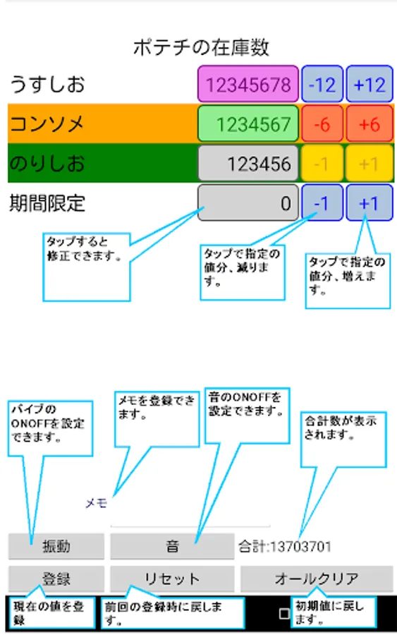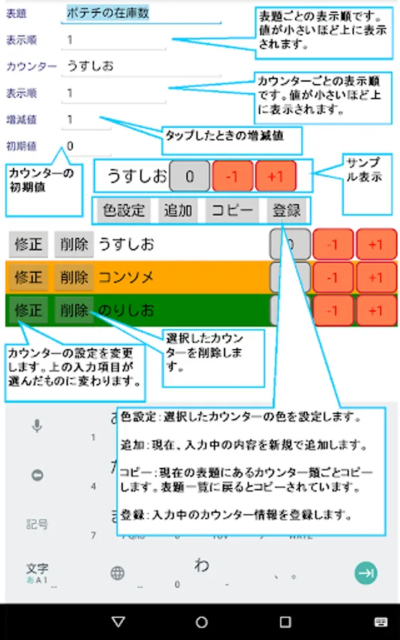 増減値や文字、背景色やボタン色まで細かく設定できます。
