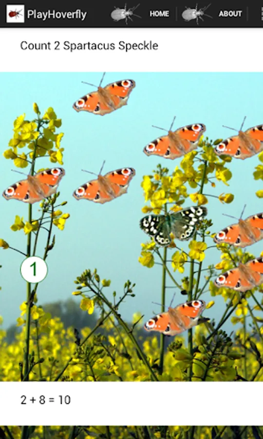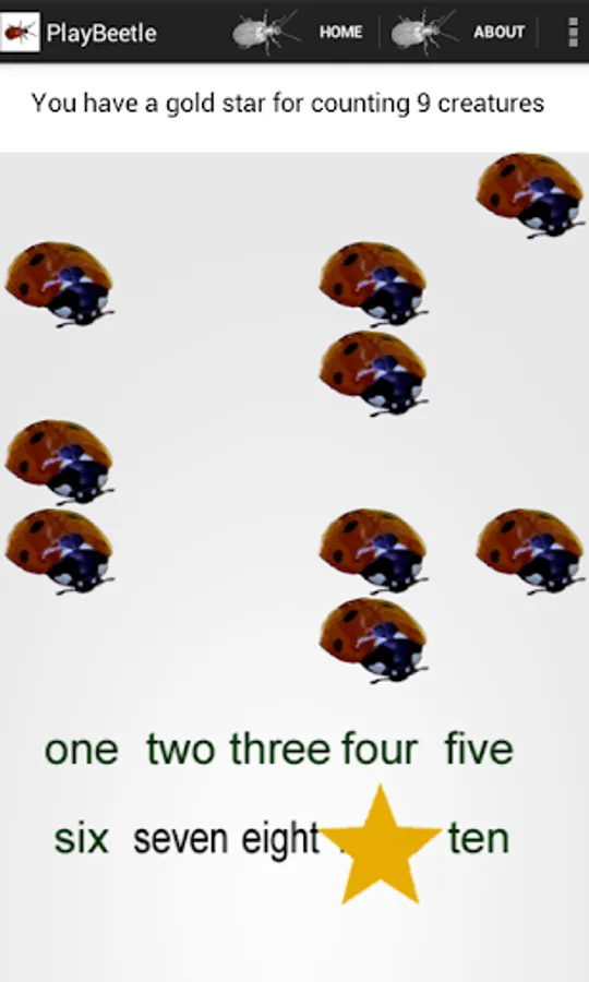 Counting creatures has four different ways to count: count the creatures and press the correct number; count the creatures and press the correct word; touch each insect up to the correct number; and touch first one creature then the other to learn the many ways two numbers add up to ten.