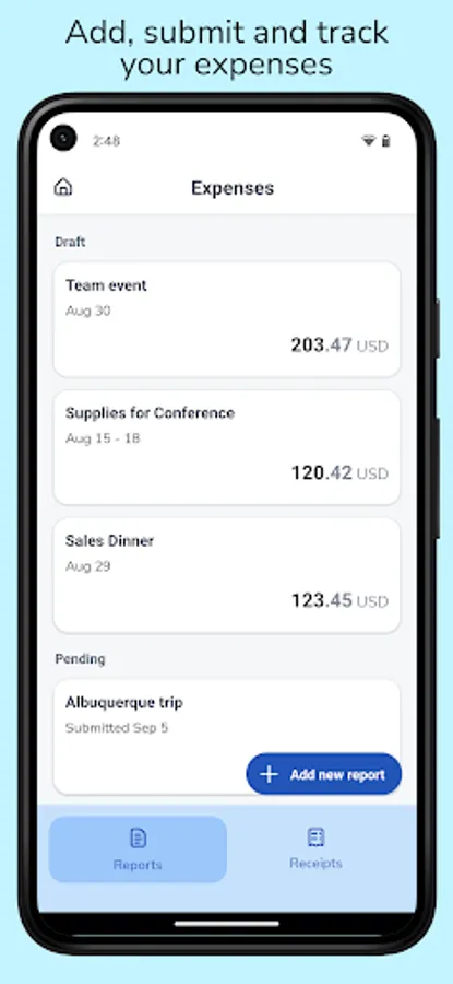 • Capture expenses easily with receipt photos and quick OCR, or manual entry