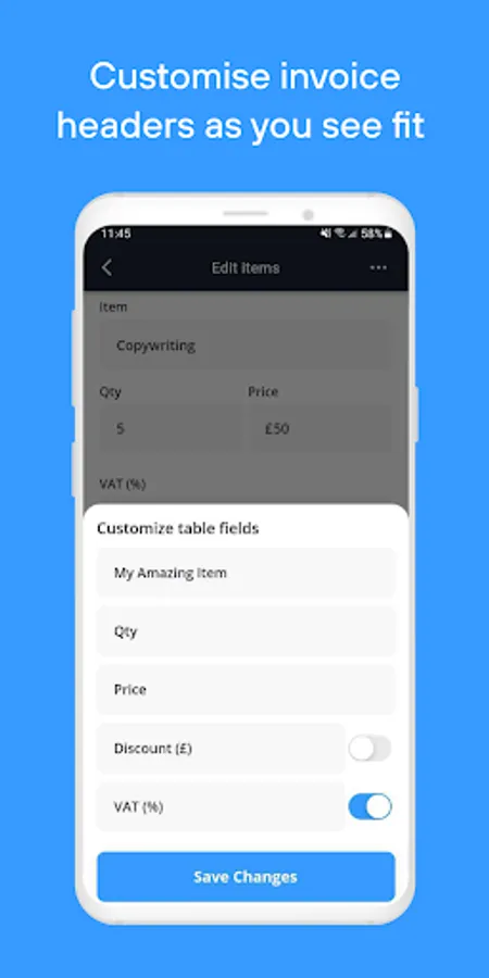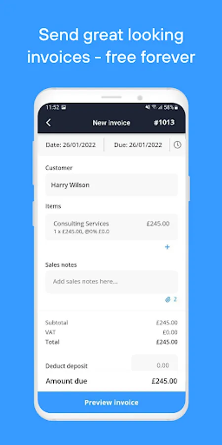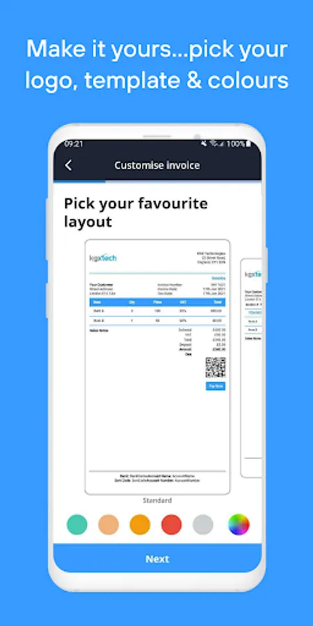 Send unlimited quotes and invoices to as many customers as you like. It will auto prompt you the details next time to save you from keying in for every invoice. Customise and make the invoice your own - choose your template, upload your logo and pick your brand colours. Make an impression on your customers with bespoke professional invoices!
