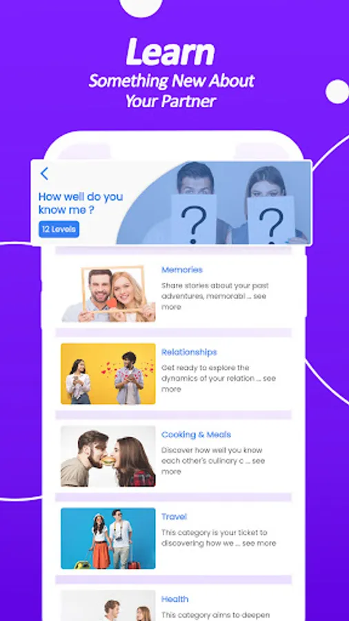 Relationship games for couple offers a variety of fun and engaging couple compatibility tests and challenges designed to strengthen love between partners. From relationship quizzes to couples activities, our couple app has something for every couple. Test compatibility with your partner and discover new things about each other through our couple questions. And with new content added regularly, there's always something new to enjoy and explore together.