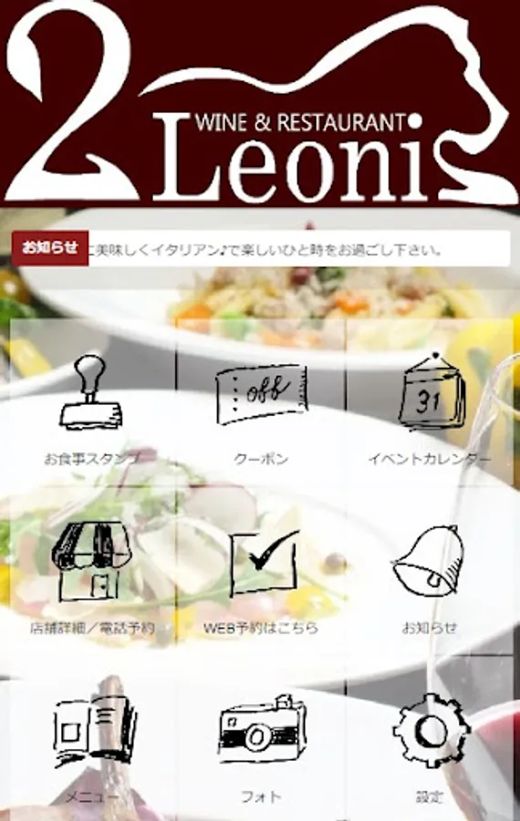 It is the official Android app of the Italian restaurant [2Leoni] in Funabashi City, Chiba Prefecture.