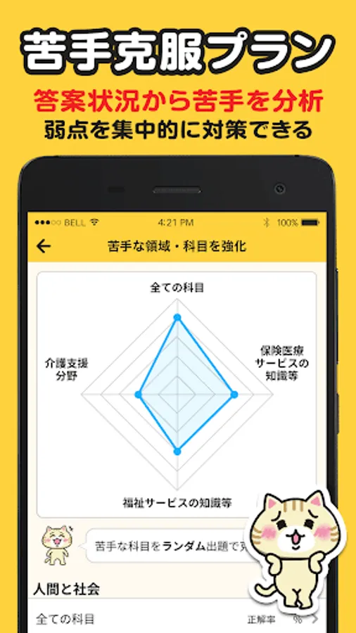 The correct answer rate is calculated from the answer results and evaluated on a 5-point scale. You can check your weak areas on the radar chart.