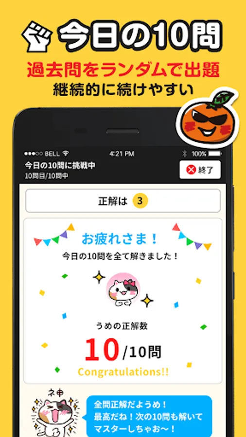 The original characters Ume, Konbu, and Mikan from “Minna no Care” appear on the top screen after logging in and on the screen after you have solved all the problems! It will soothe your tired mind from studying.