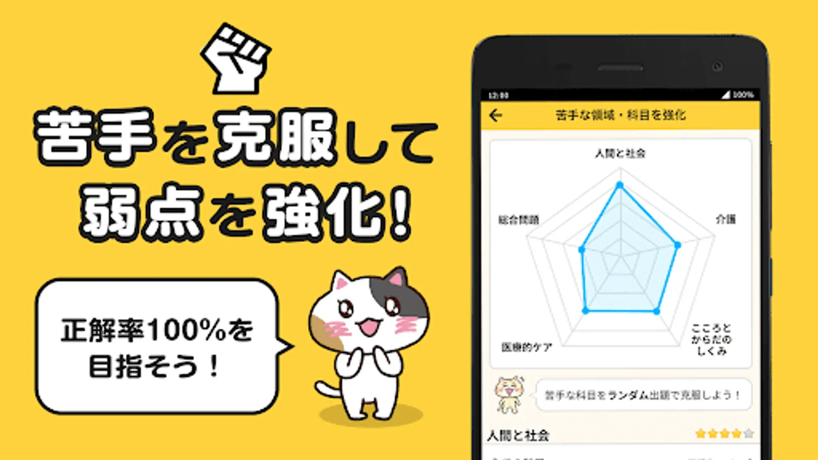 The accuracy rate is calculated from the answer results and evaluated on a 5-point scale. You can check your weak areas on the radar chart.