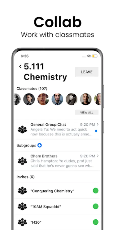 SUBGROUPS: Under each class, you can create a subgroup and invite other classmates. Each subgroup has its own chat. With subgroups you can host group chats for your close friends, dorm or even group projects. The possibilities are endless.