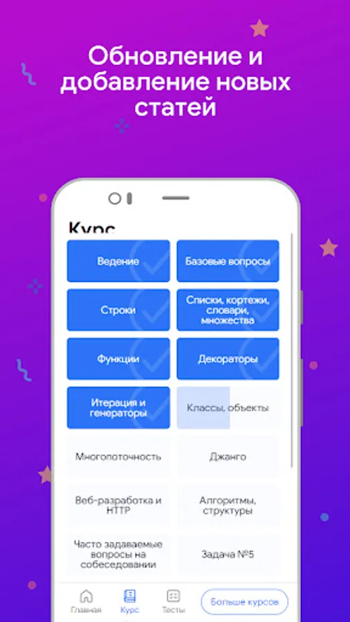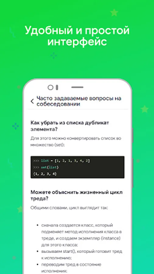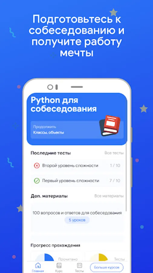 Articles and tests with different levels of difficulty will help you quickly master all the essentials and successfully pass the Python developer interview and get the desired position.