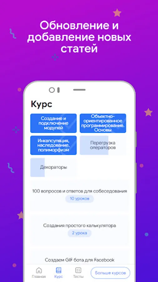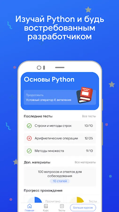 The application allows you to gain knowledge that will help you use Python more efficiently. Prepared articles and tests with different levels of difficulty will help you quickly learn everything you need to start programming or improve your skills
