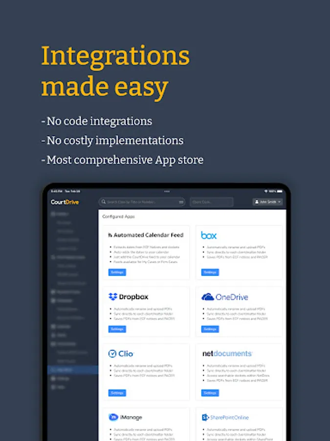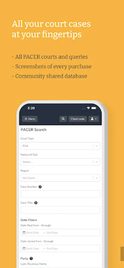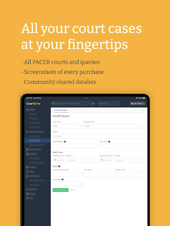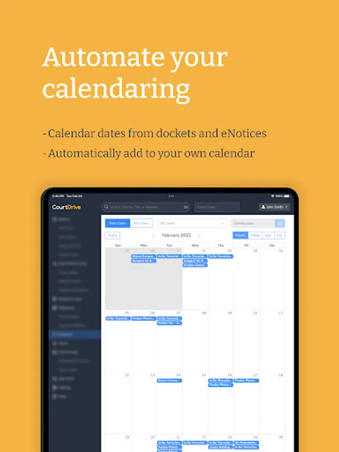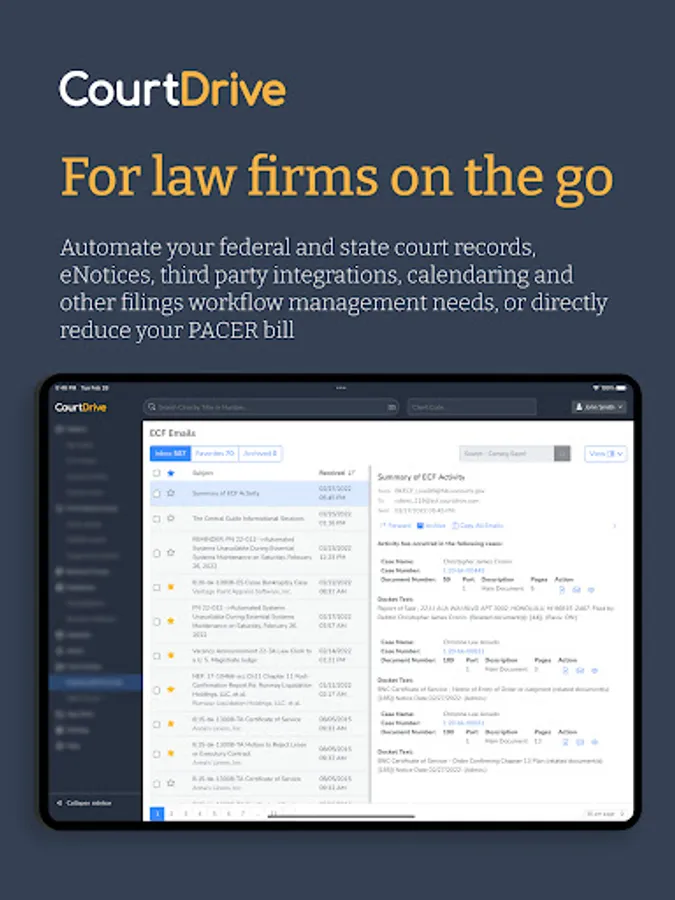 The CourtDrive Mobile App lets you automate your federal and state court records, eNotices, third party integrations, calendaring and other filings workflow management needs, or directly reduce your PACER bill.