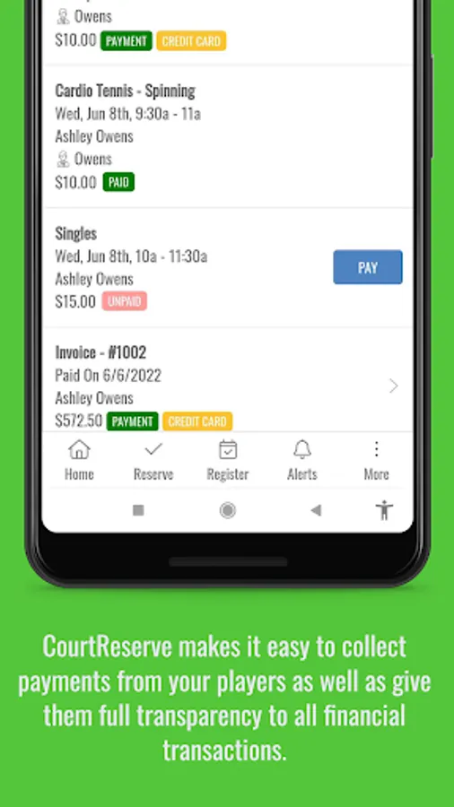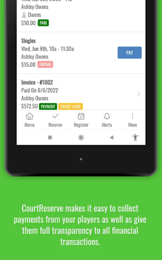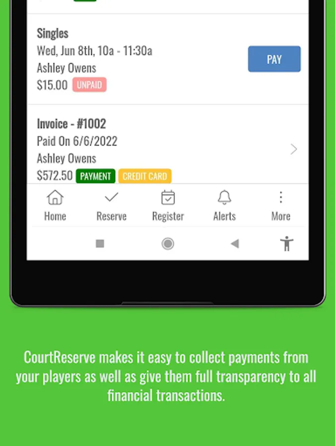 CourtReserve gives you the ability to get paid upfront to secure online bookings. With complete tracking of all your financials without having to hire expensive accountants, you can rest assured that you are staying in business and can grow your organization.