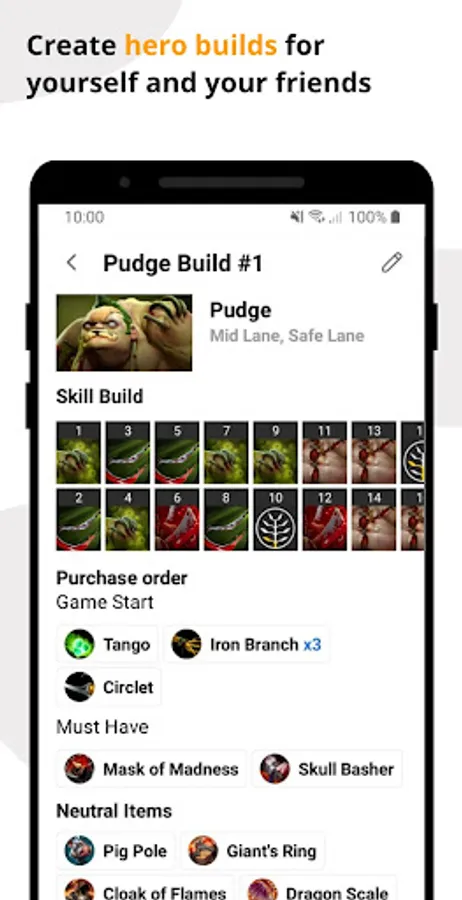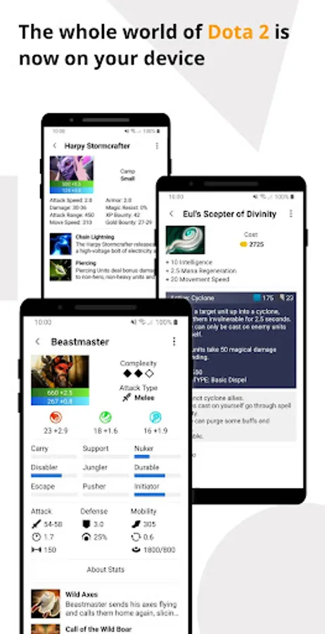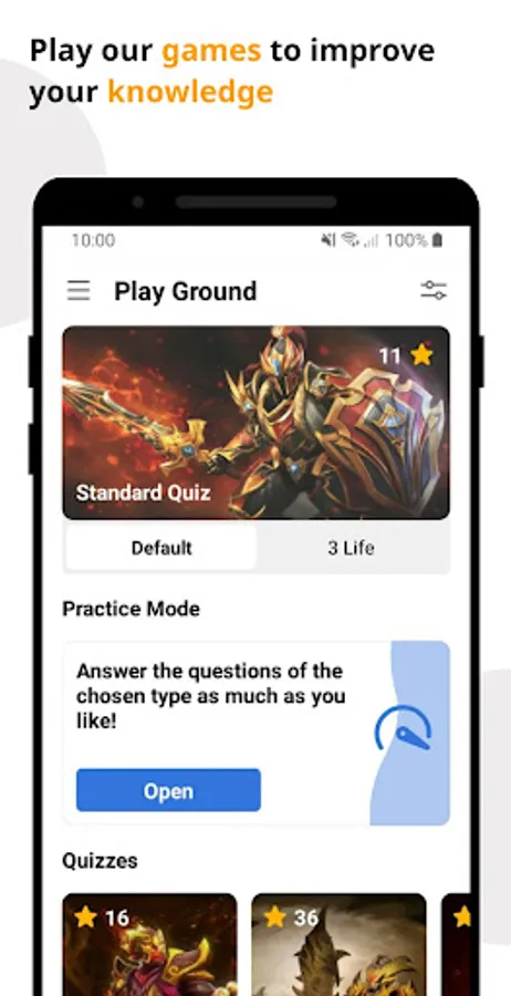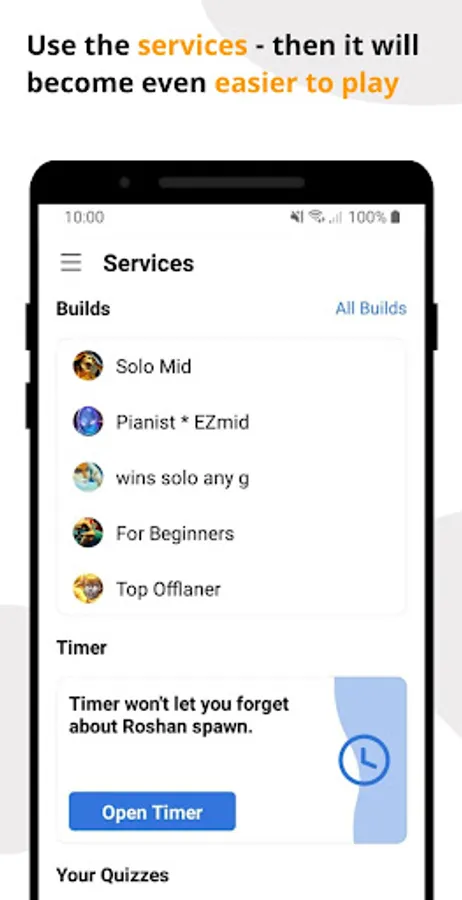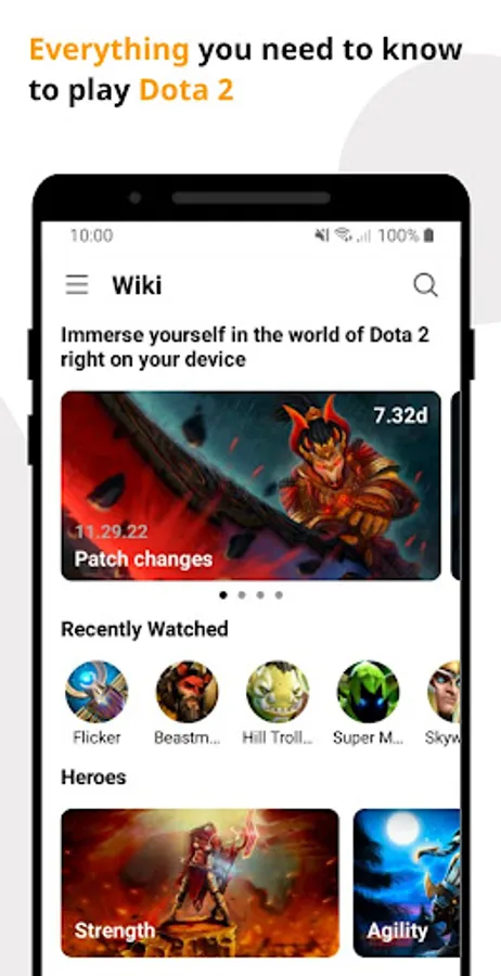 In the application, you can both get new knowledge of Dota 2, and check the existing ones in our Quizzes and Mini-Games.