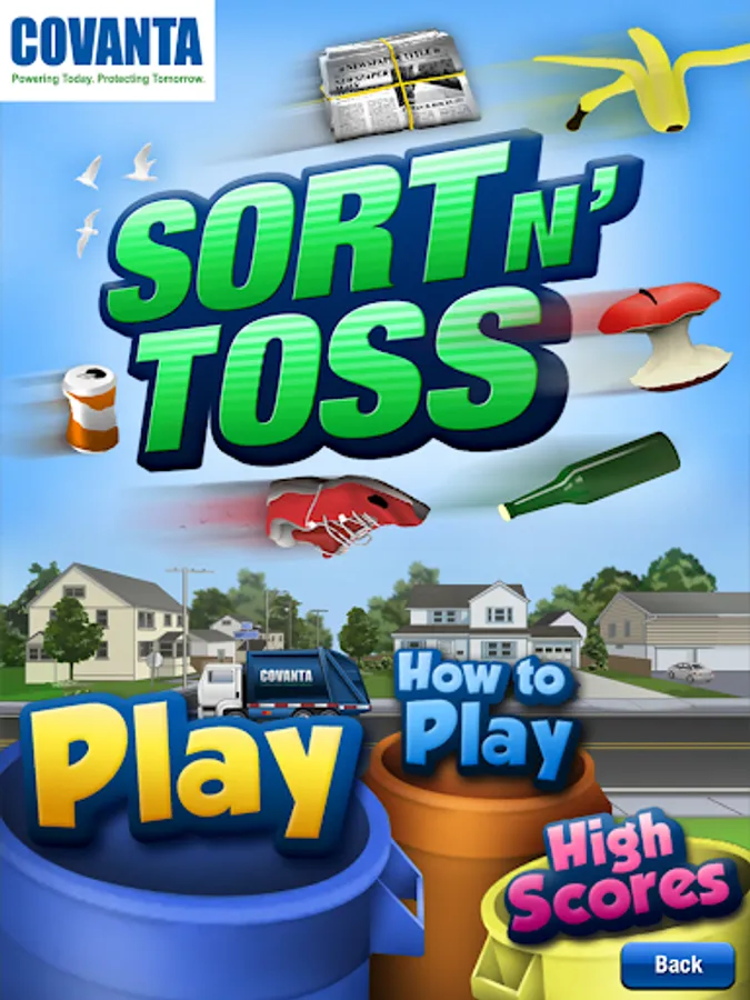 Sort n’ Toss: Sort every day household trash into the correct bins. Make sure you know where items belong to avoid receiving a strike! As you progress through the levels, the bins get further away and there are more items to sort. Ready, set, aim!