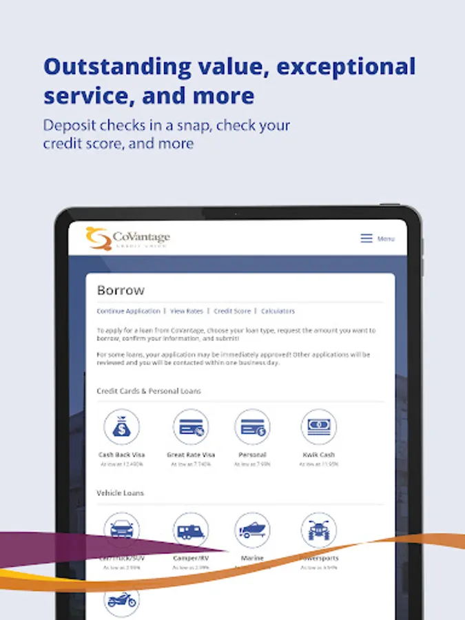 • Apply for a loan, including credit cards, autos, powersport, marine, and recreational vehicles