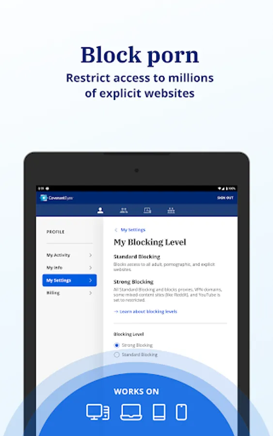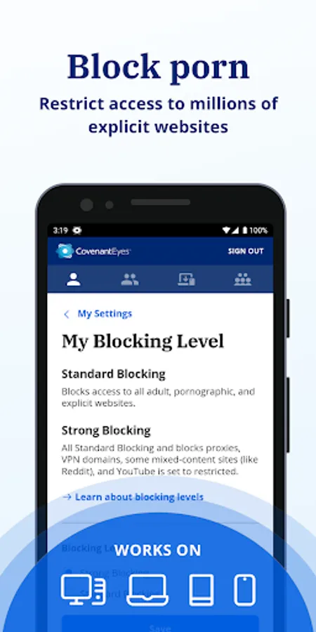 The Covenant Eyes app also provides you optional protection through porn blocking, forced SafeSearch, and customizable domain block and allow lists to help avoid triggering websites and content. For best results, install the Covenant Eyes app on all the devices you use.
