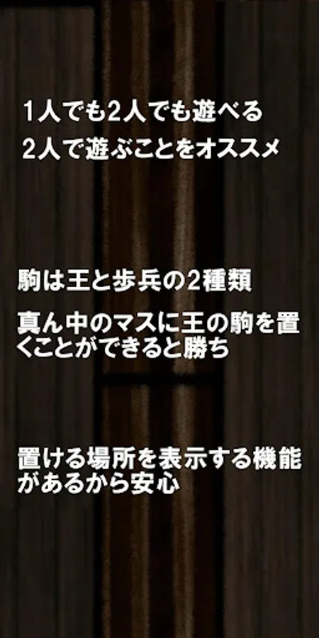 置ける場所を表示する機能があるので、真ん中に王を置ければ勝ちと知っていれば簡単に遊ぶことができます。