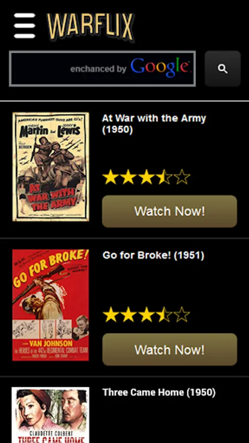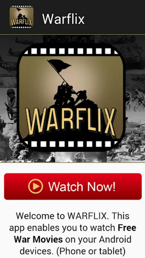 Who does not like free movies? The Warflix.tv application runs in your web browser and connects you to a large database of free historical war films you can watch on your Android smartphone, tablet or computer for free. No need to install anything else. Just get this app, sit back and enjoy some great war classics on your mobile device.