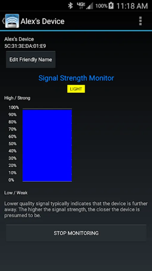 When a CTG device is discovered, the app will display its broadcasted name and a mac address and allow you to start a monitoring session. While monitoring, the app will display your device's signal strength in real-time using a bar graph. Additionally, you can setup detection alerts (vibration and a short sound) that will notify you when a device is discovered during your live monitoring session without having to keep an eye on the phone. Alerts can be configured as a one-time alert (triggered when a device is initially detected during your session) or scaling (alert gets faster as the RSSI signal gets stronger). This app also gives you an option to assign a friendly name to the discovered CTG device or you can assign it ahead of time if you know your device’s ID.