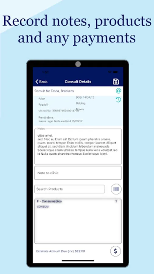 Covetrus Mobile Vet is an app that connects with RoboVet and VisionVPM. The app enables vets to track appointments, record consults, product usage and any payments received when working away from the clinic. Products transferred between clinic and vehicle can also be recorded through the app which can benefit more accurate stock control. The app syncs with the clinic to ensure data is up to date.