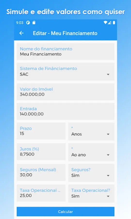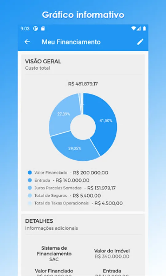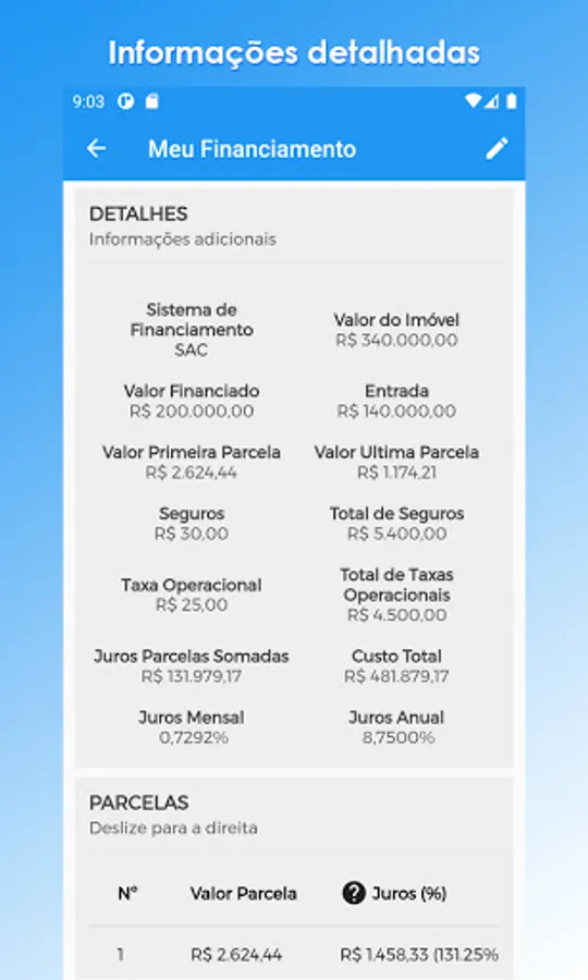 Do you have doubts about your financing values or just want to do a simulation? In this application the numbers are opened and you can see the following information in detail with a graph and spreadsheet:
