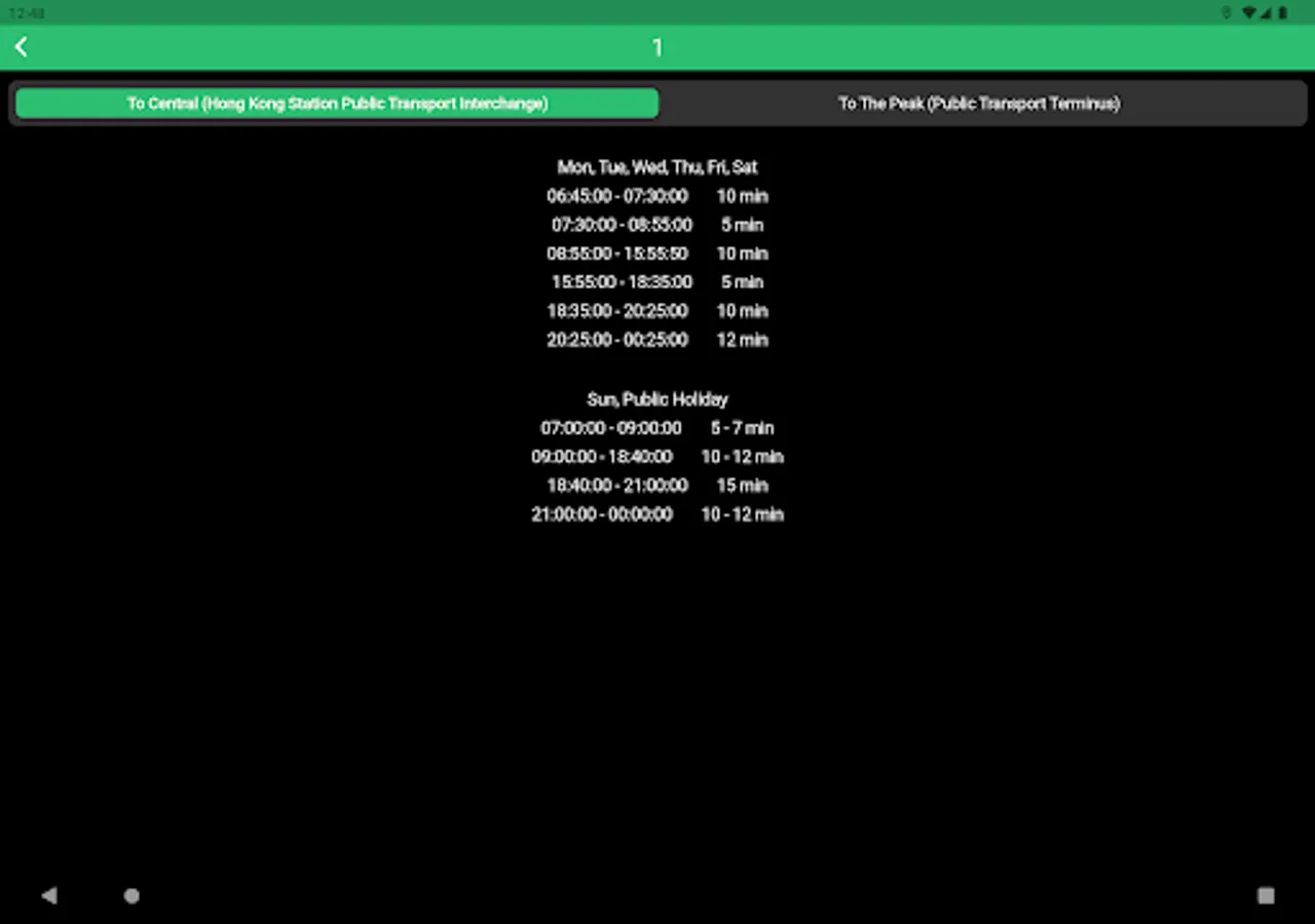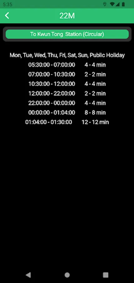 時間表頁面則清楚顯示路線的服務日及開出間隔,以便用戶查詢非繁忙時段及首尾班車開出時間。