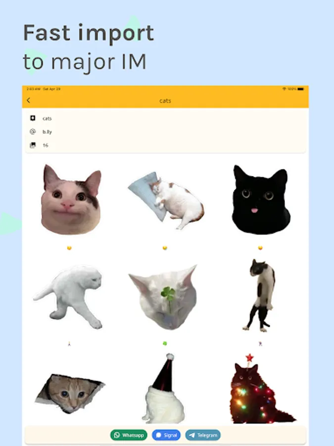 Moreover, StickerPark also allows you to add animated stickers to instant messaging applications, making your conversations more interesting. Whether you're sending funny expressions during chat or showcasing your creative talents on social media, our app makes it easy for you to achieve your goals.
