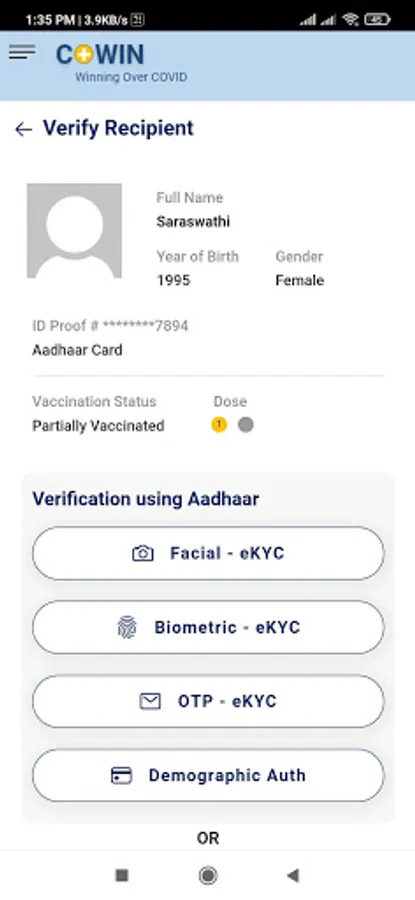 2) Beneficiary Verification: Beneficiary's relevant details can be captured in encrypted form which can be utilised to ensure that vaccine is administered to relevant Beneficiary. This is applicable at the time of registration as well as vaccination.