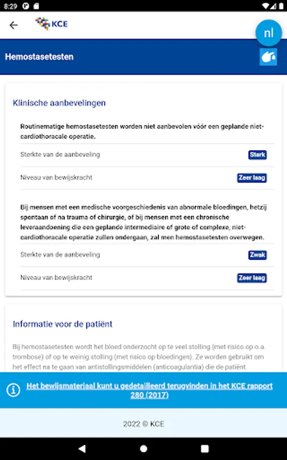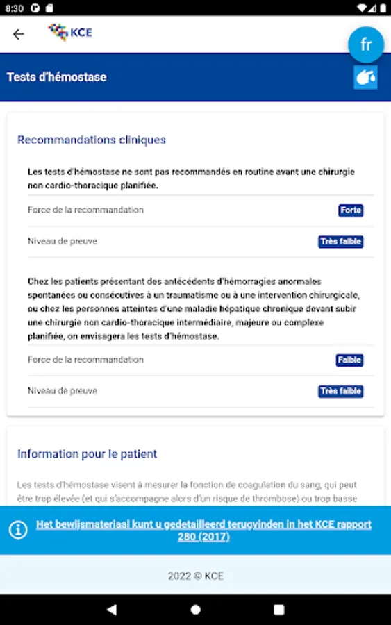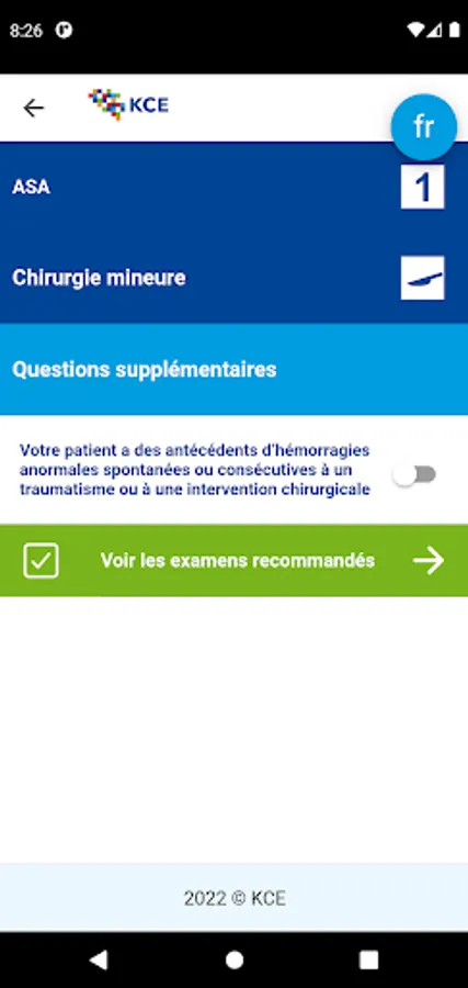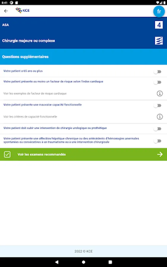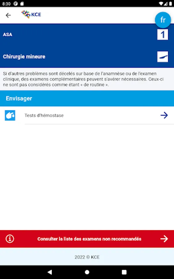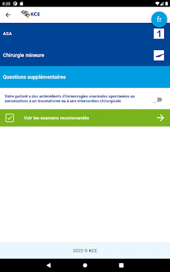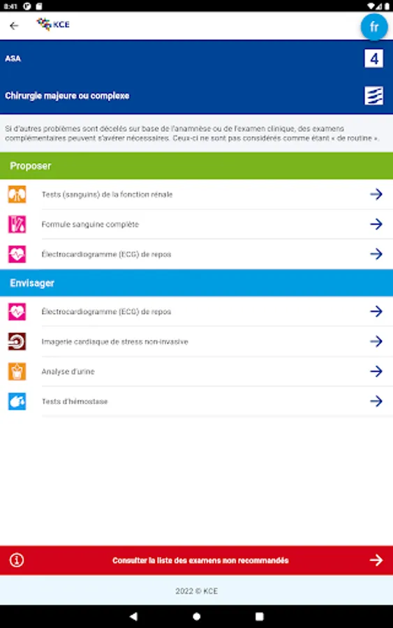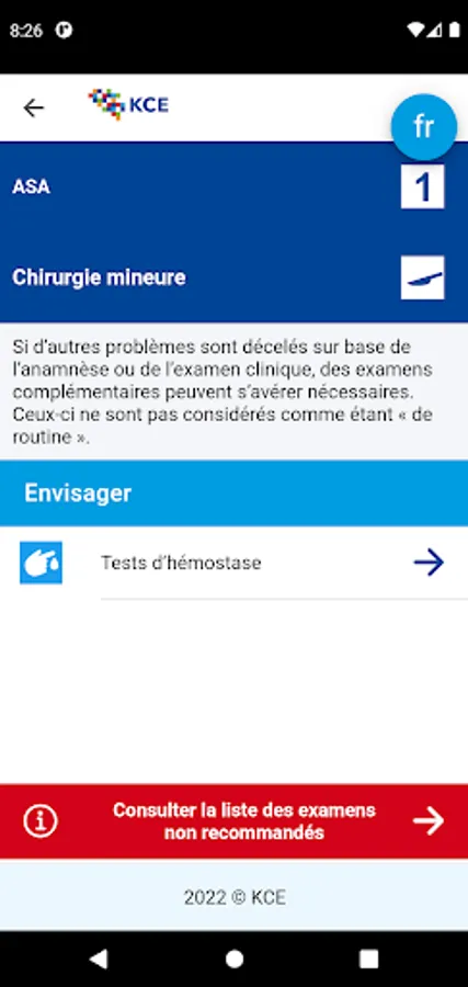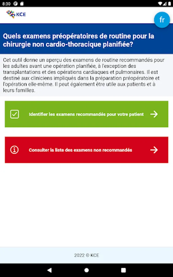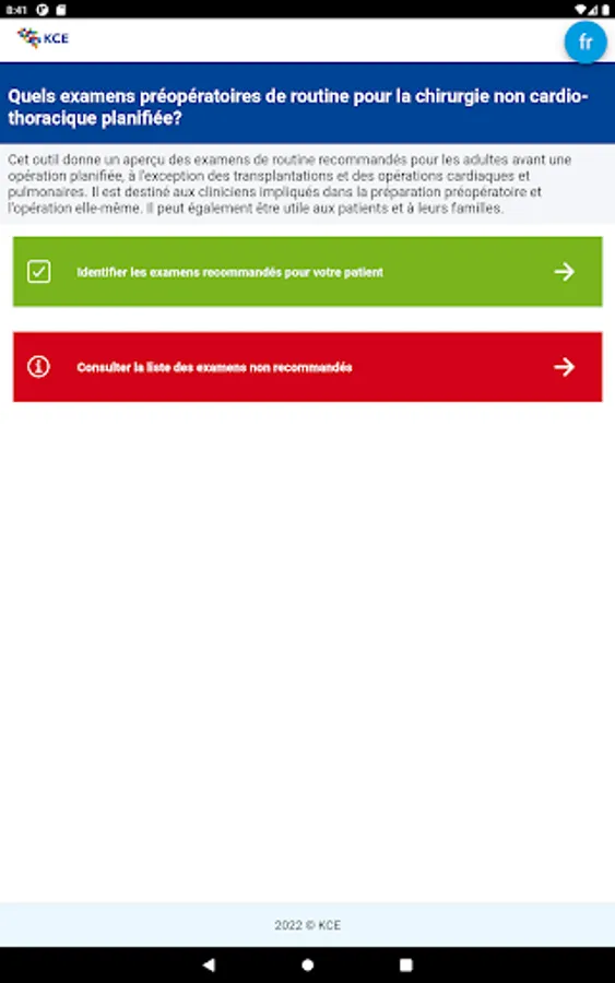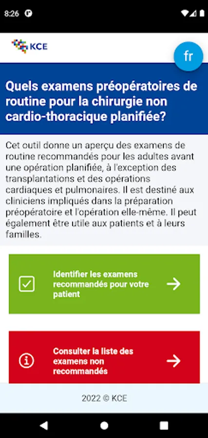 This app is based on an algorithm that provides an overview of recommended routine tests for adults prior to planned surgery, with the exception of transplants and heart and lung operations; this algorithm has been developed as part of the KCE report 280 (2017). It is intended for clinicians involved in preoperative preparation and the operation itself. It may also be useful to patients and their families. The algorithm is available in PDF format at https://preop.kce.be/en/ If you have any questions or problems with the app, please use the contact link on the website https://preop.kce.be/en/