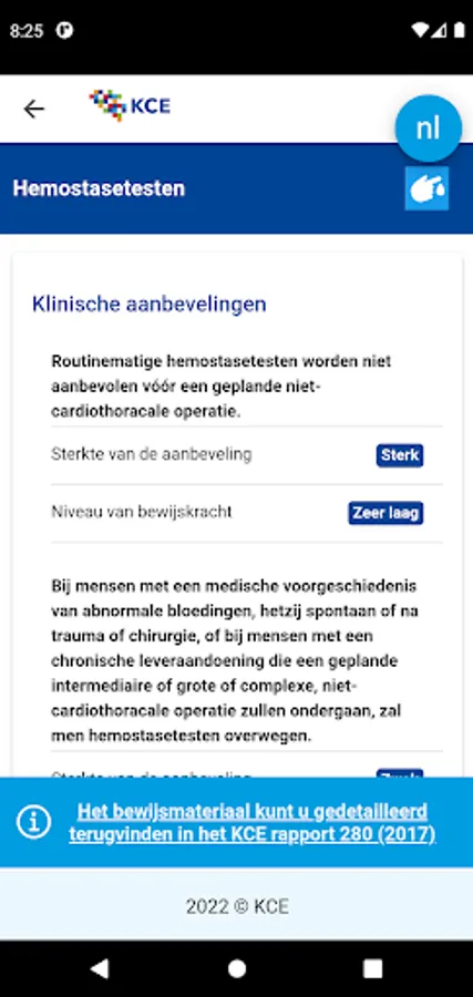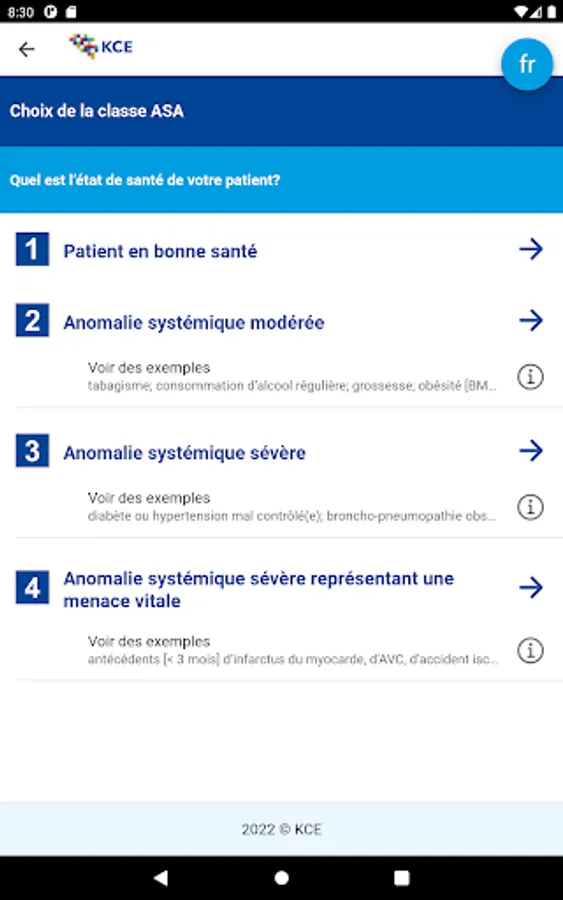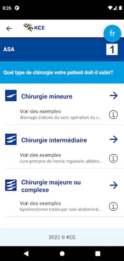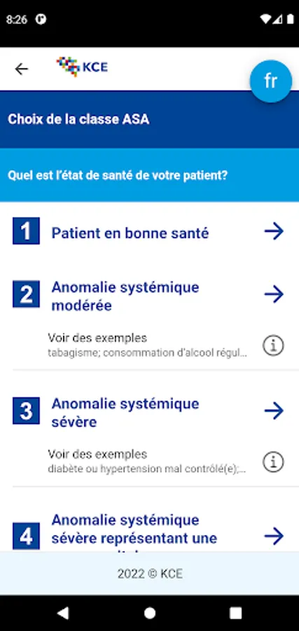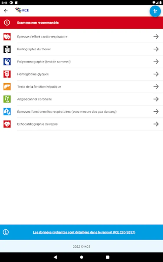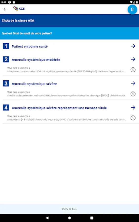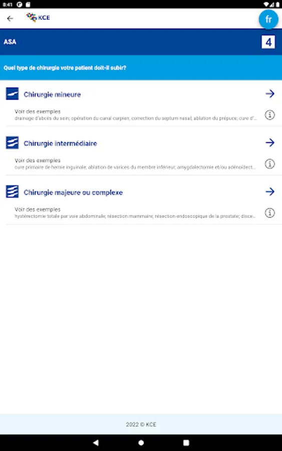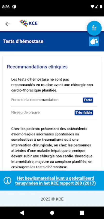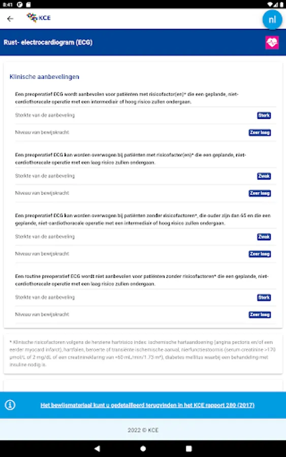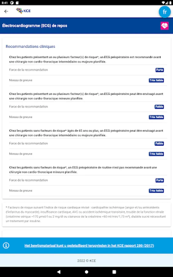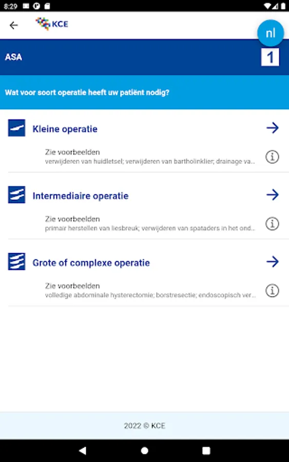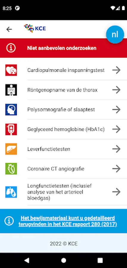 This app is based on an algorithm that provides an overview of recommended routine tests for adults prior to planned surgery, with the exception of transplants and heart and lung operations; this algorithm has been developed as part of the KCE report 280 (2017). It is intended for clinicians involved in preoperative preparation and the operation itself. It may also be useful to patients and their families. The algorithm is available in PDF format at https://preop.kce.be/en/ If you have any questions or problems with the app, please use the contact link on the website https://preop.kce.be/en/