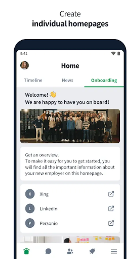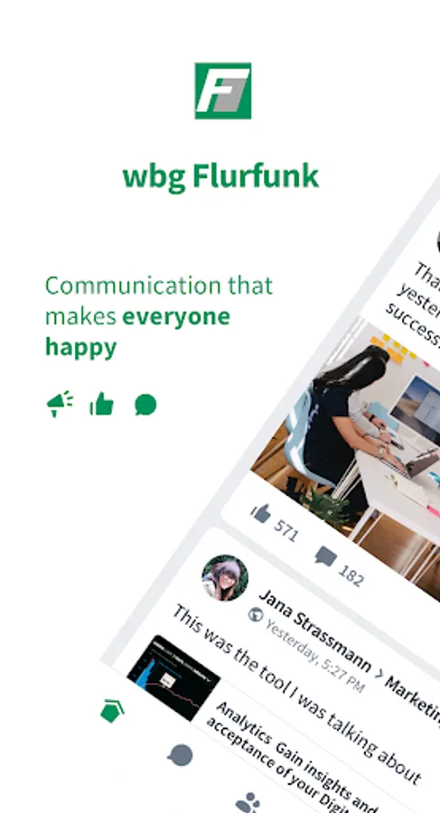 wbg Flurfunk is the social intranet of the wbg Nürnberg group. Via this app all employees have access to important company information. They are able to consume, create and share content and they can work together in workspaces.