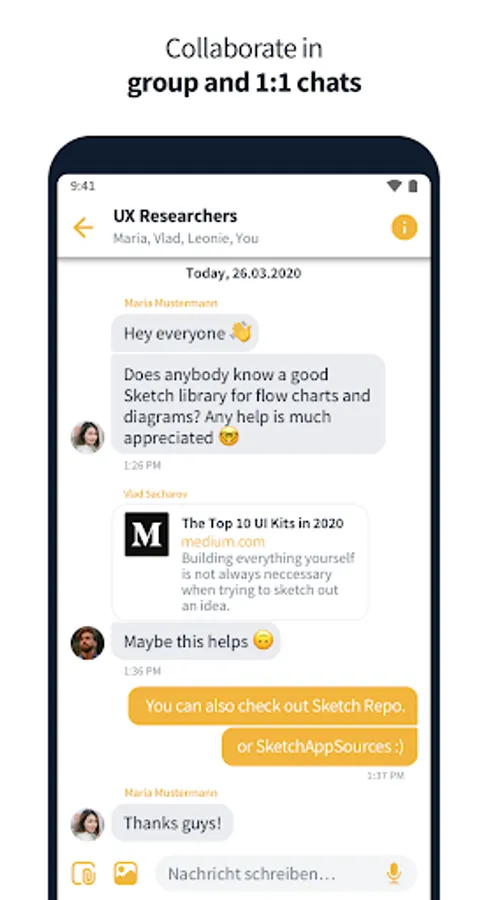 • The chat function provides an additional way of contacting individuals. With the additional option of creating group chats, the entire team can be reached at any time with just one message.