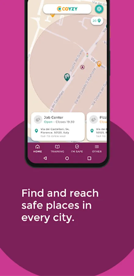 - Safe-Points: These are the safe points in the city and they can also be marked with the COYZY logo as a window sticker. There users will find trained staff which will provide trained personnel ready to give immediate help in case of need, as well as a meeting place with the COYZY Community.