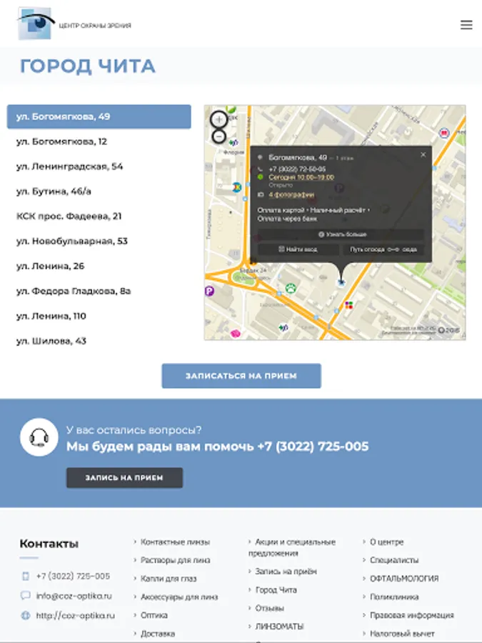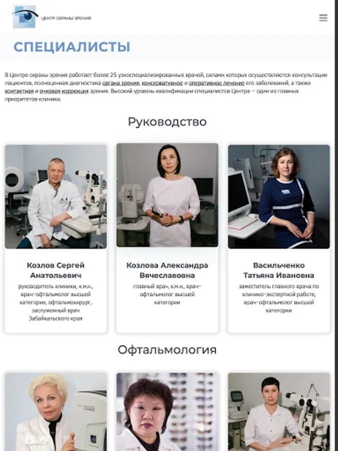 Today it is represented by a network of optical salons, ophthalmological offices and an ophthalmological clinic. The network of the Center for the Protection of Vision employs more than 40 highly qualified specialists, whose forces provide consultations to patients, full-fledged diagnostics of the organs of vision, conservative and surgical treatment of their diseases, as well as contact and spectacle vision correction.
