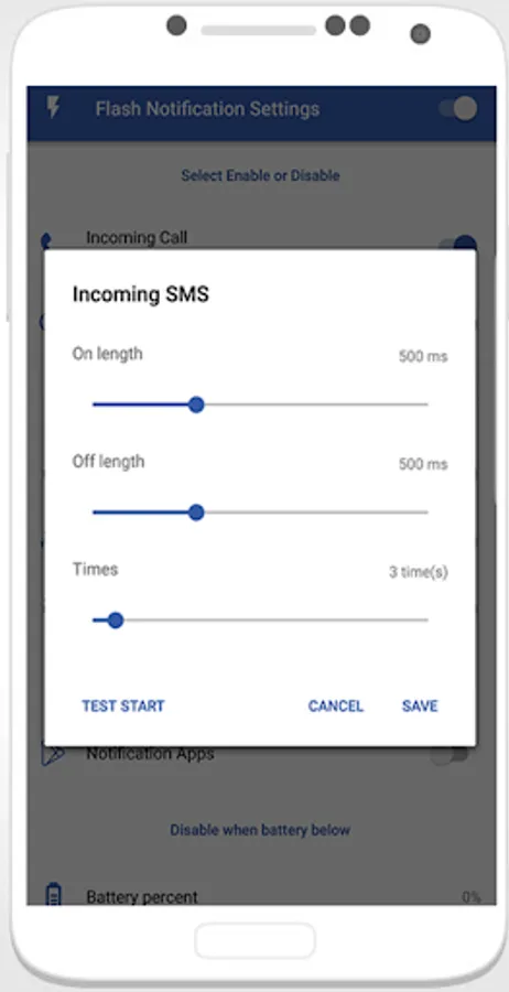 You can choose your incoming call Ringing flashlight mode from several ones and can also choose your incoming sms alert flash mode from several ones.