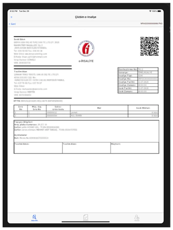 You can follow the e-Shipments produced on Çözüm Yemekçi MRP / ERP from your mobile phone. Your couriers, the drivers of your business can view the documents when necessary at the time of control from their mobile devices while transporting the products, and you will get rid of the printing process and costs!