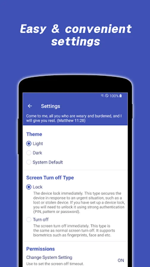 Use to turn off the screen when using app widget or quick setting tile. No personal information and data is collected or shared.