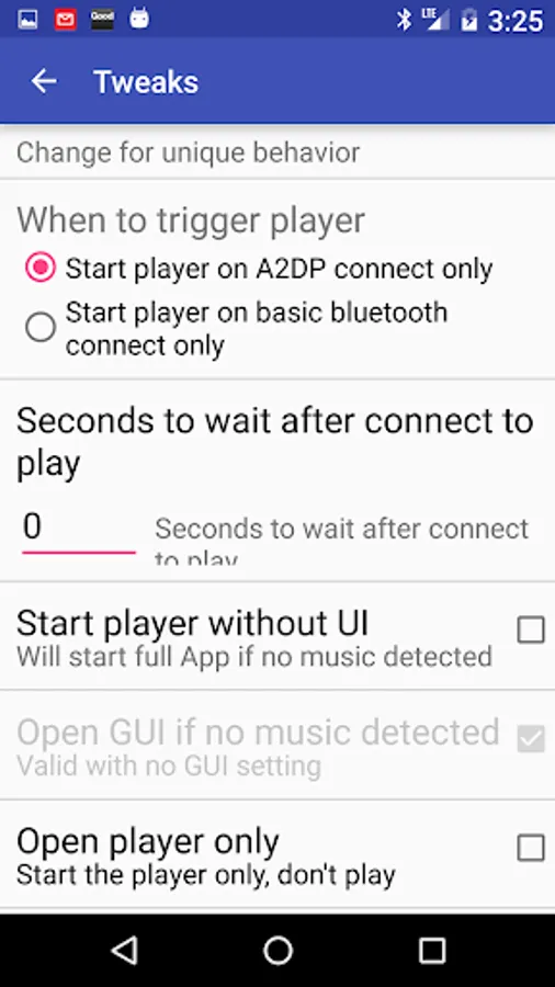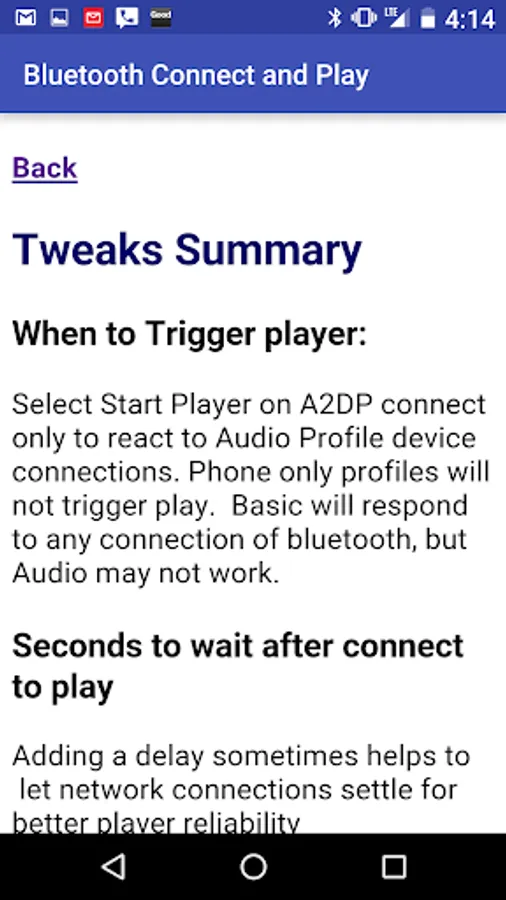 This app is designed to tie the Bluetooth connect event to playing the music player of your choice. Unlike other auto-play options, this allows you to select the specific player that should be used. Do you want a Podcast to start instead of music, you can select that, do you want a specific music app to play when you enter your home vs car or put on headsets and head to work out... no problem.
