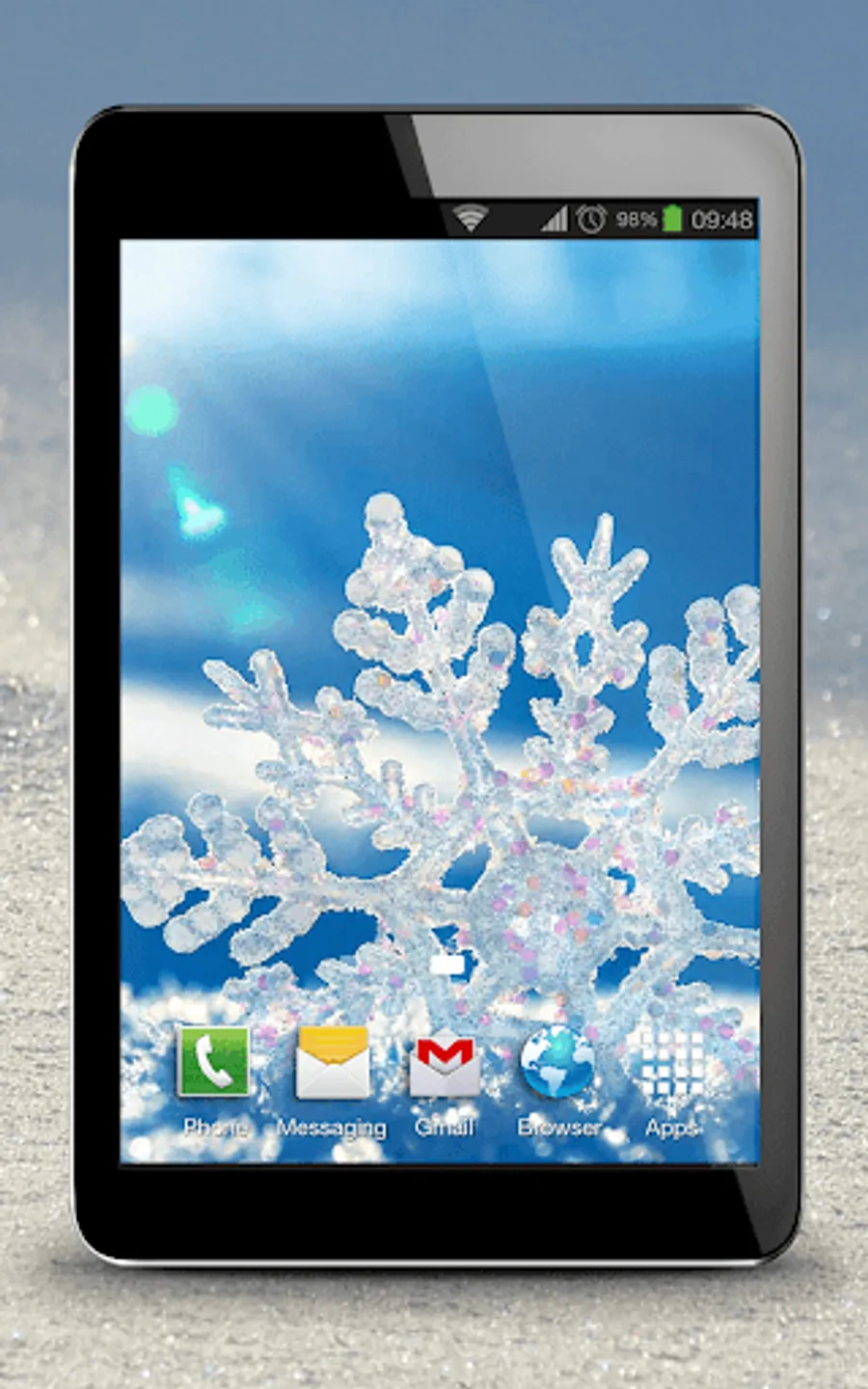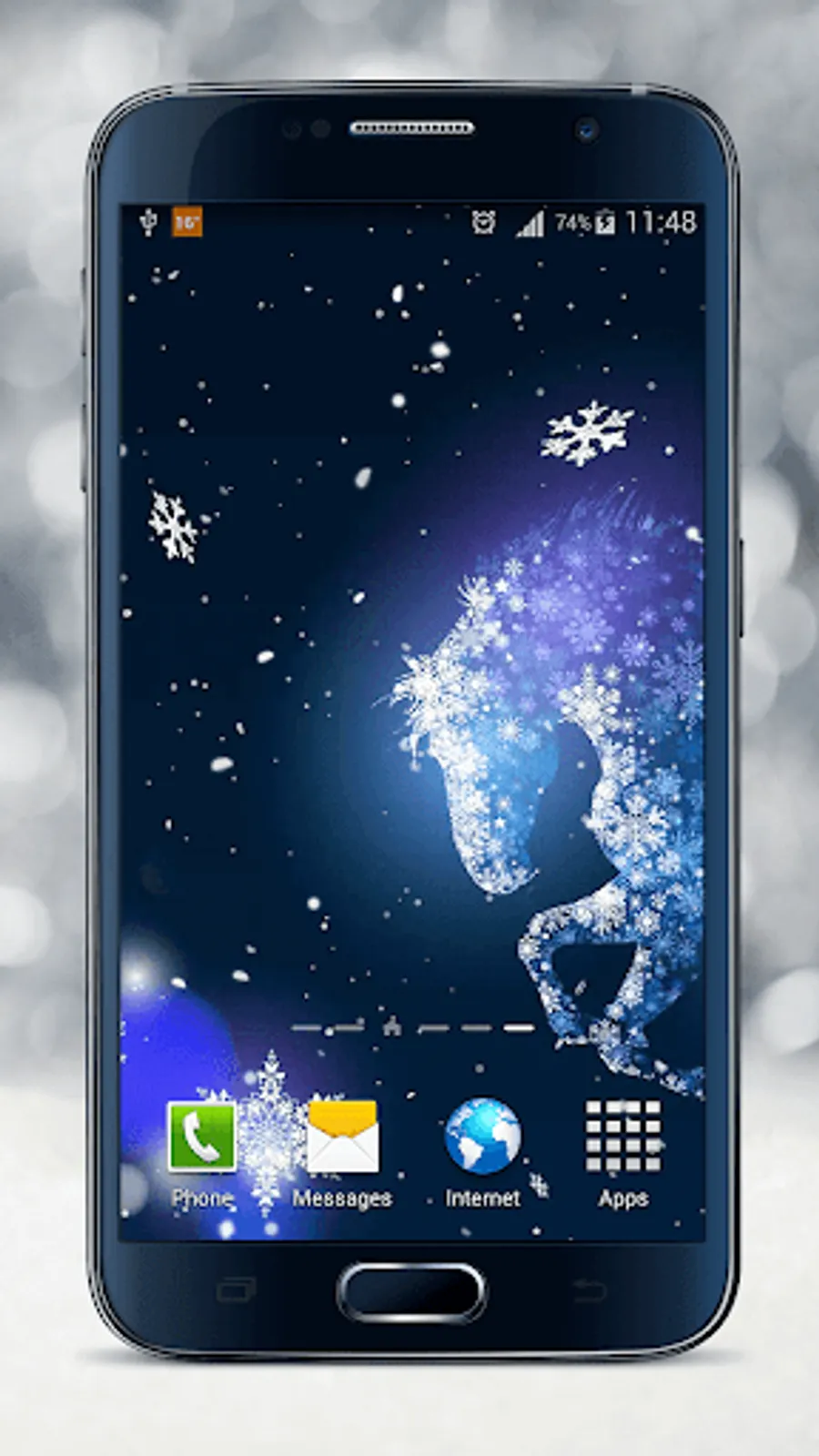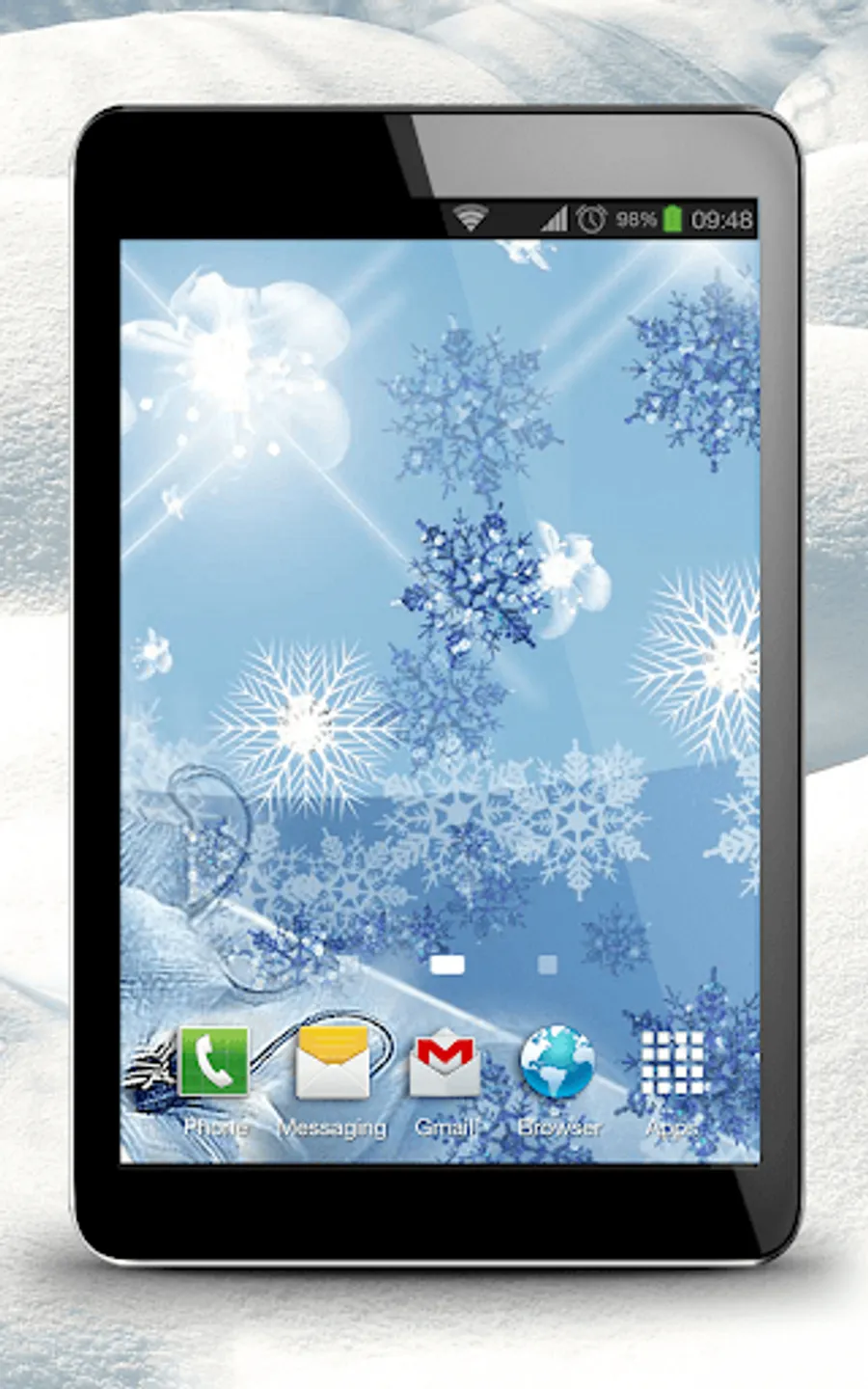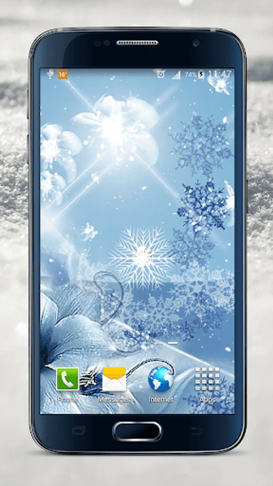 ❄ Long press on the home screen until the menu labelled “Set wallpaper” comes out, choose the category “live wallpapers” and scroll to “Snowflake Live Wallpaper”.