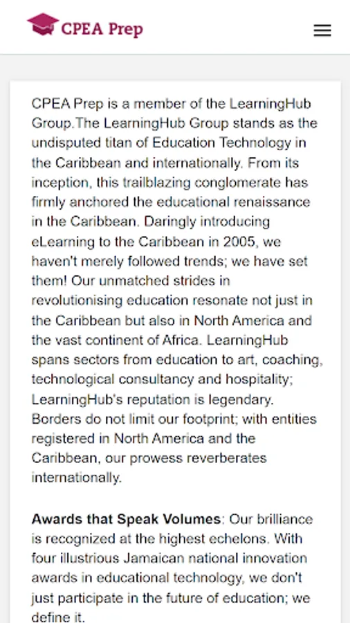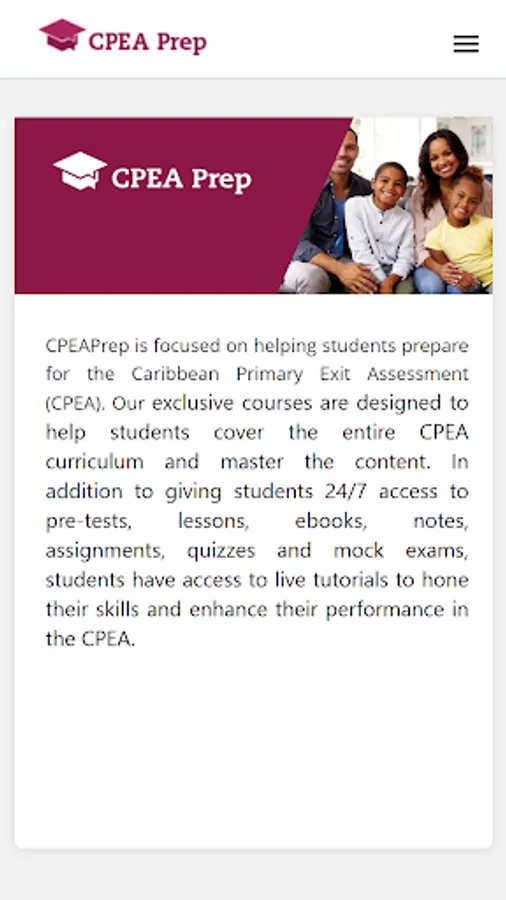 CPEAPrep is focused on helping students prepare for the Caribbean Primary Exit Assessment (CPEA). Our exclusive courses are designed to help students cover the entire CPEA curriculum and master the content. In addition to giving students 24/7 access to pre-tests, lessons, ebooks, notes, assignments, quizzes and mock exams, students have access to live tutorials to hone their skills and enhance their performance in the CPEA.