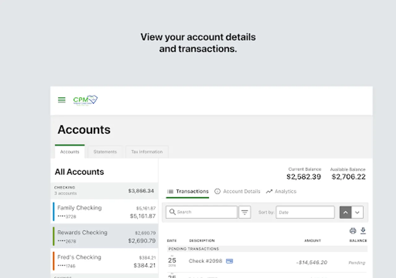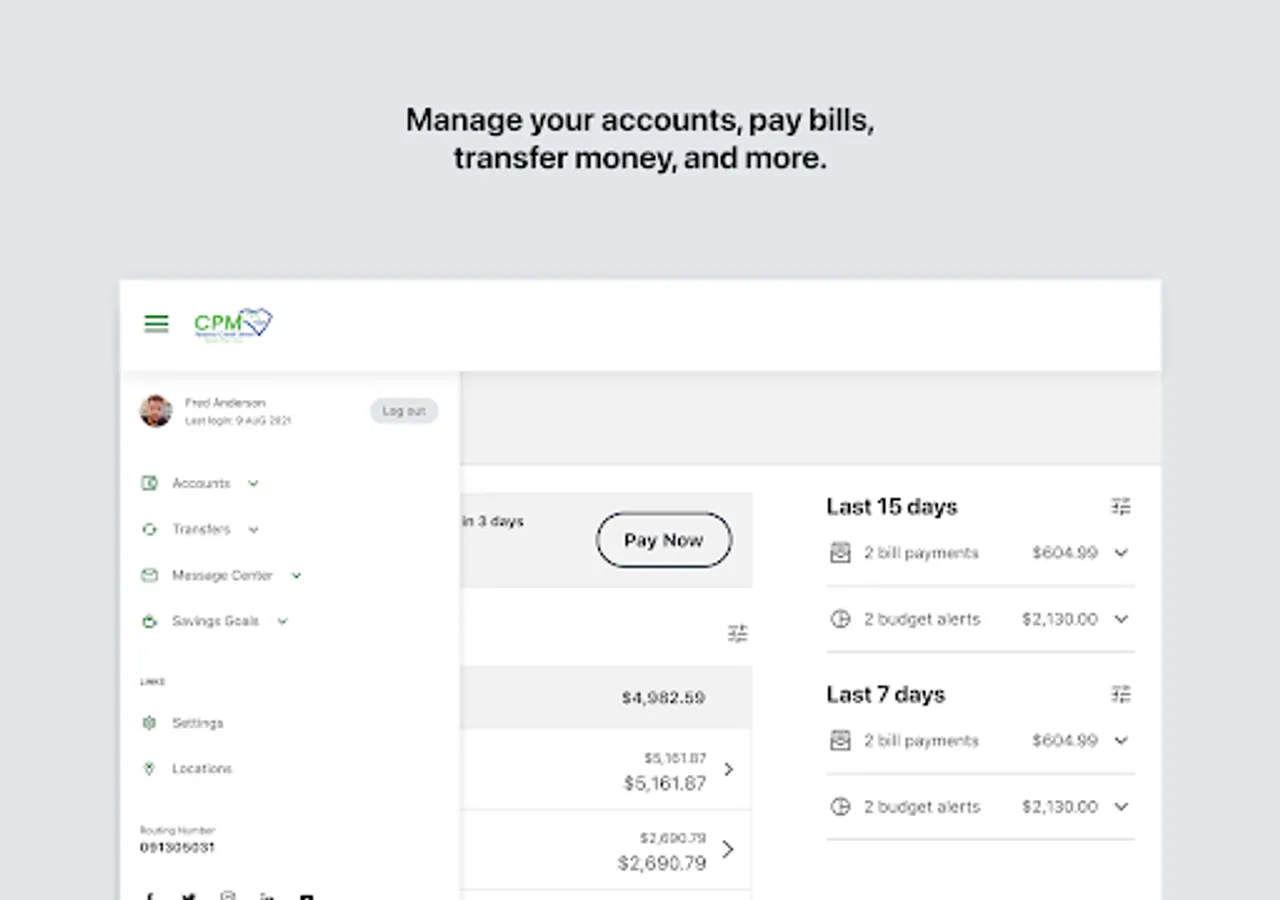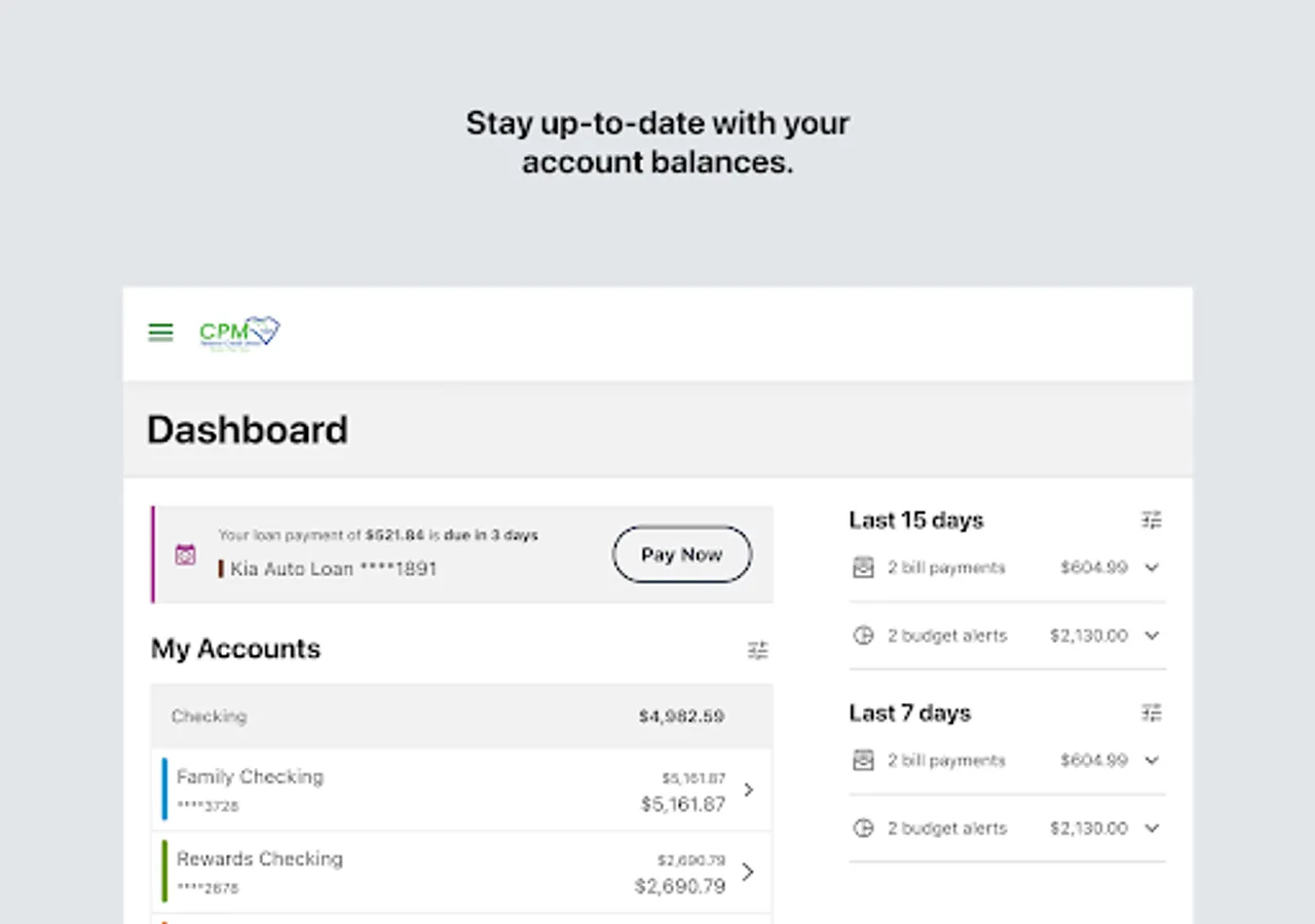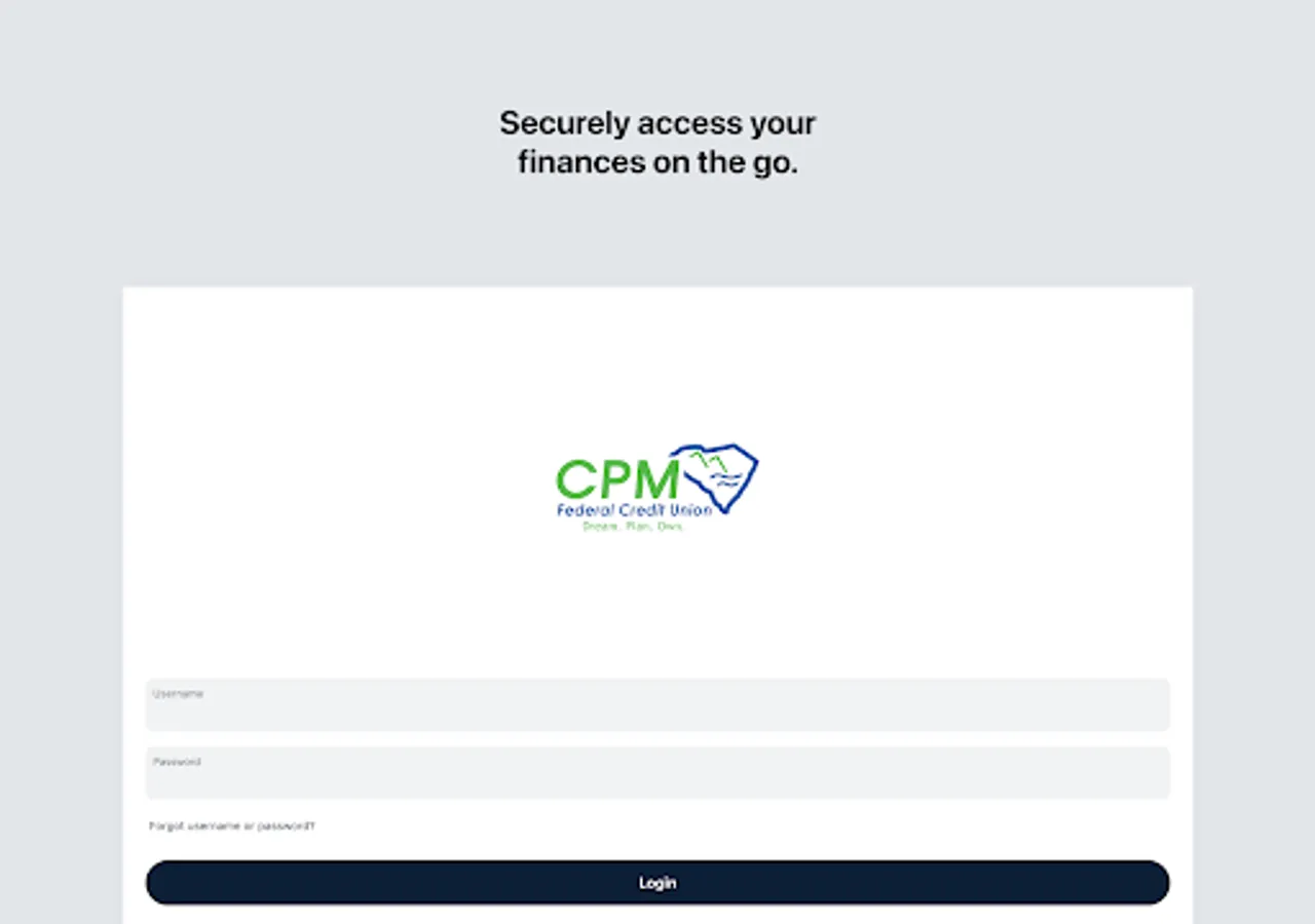 Sign in to your account to access the same features and convenience available thru CPM Anytime Online Banking! View your account balance, make transfers or loan payments, make deposits, pay bills, find locations and control your debit or credit cards, all with ease.