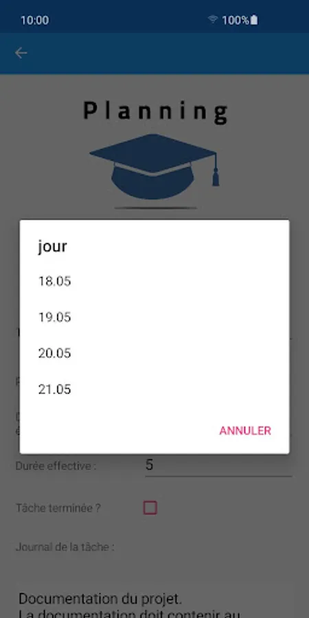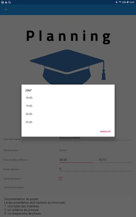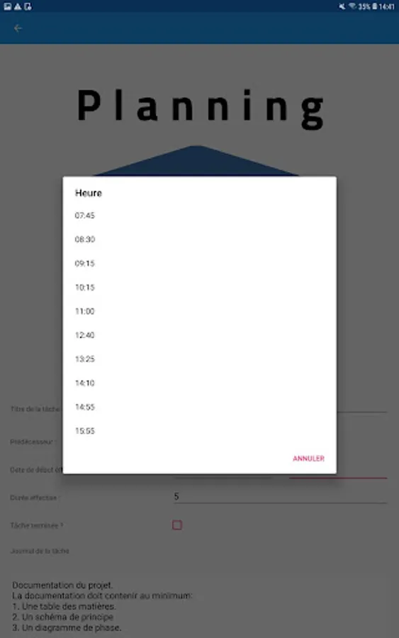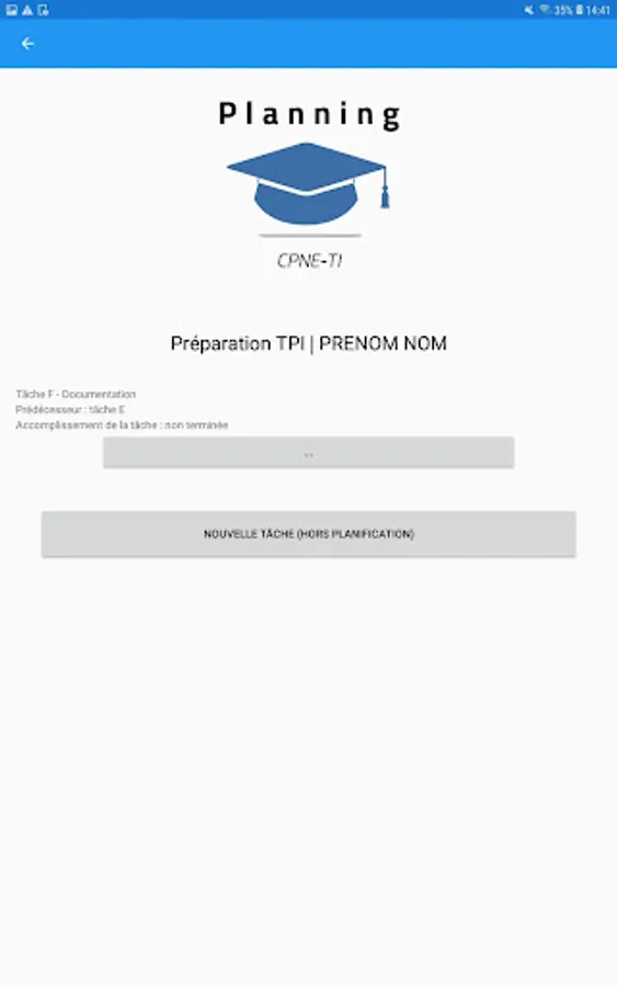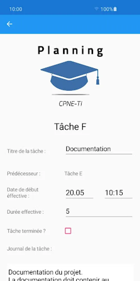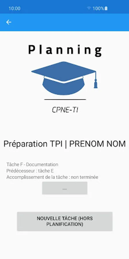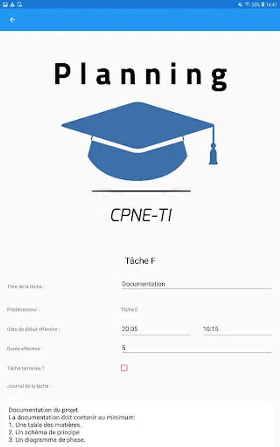 This application allows students of CPNE-TI to manage the tasks they have to do for a project. The application is particularly useful for specialization projects. It facilitates the organization of work periods so that students can focus on their work fully. It also facilitates follow-up between the student and the teacher, making it easier to carry out TPI work.