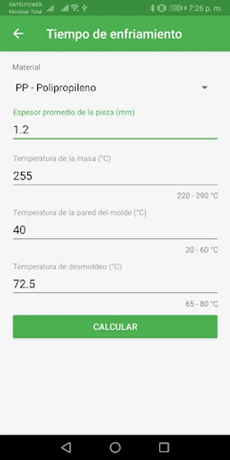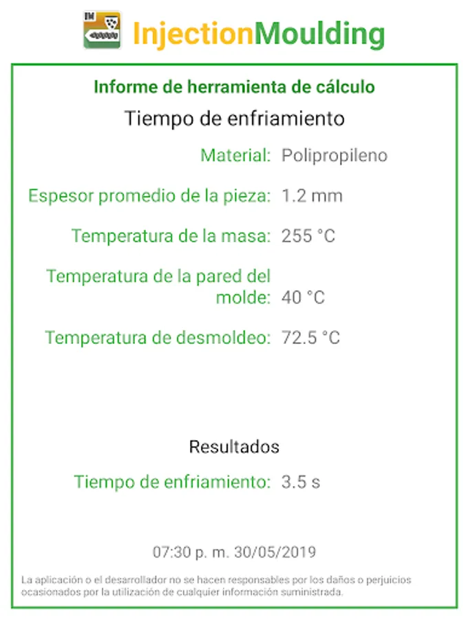 The application is to calculate the initial parameters to be placed in the injection machine, injection molding, plastic injection, polymer injection such as: