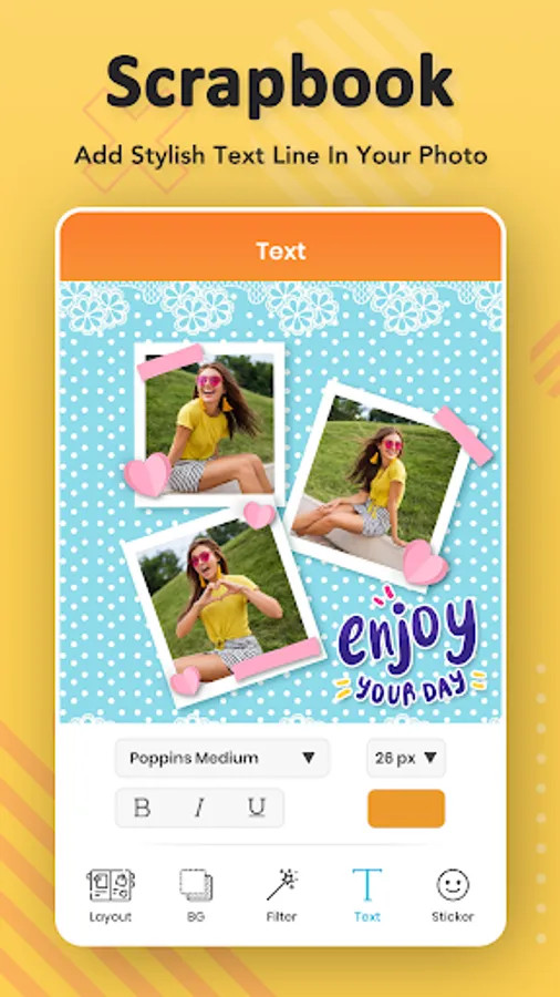 - Add text, text style, text color on photo or picture with scrapbook maker.