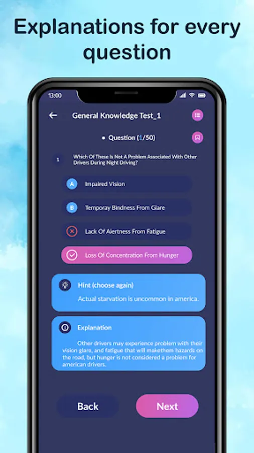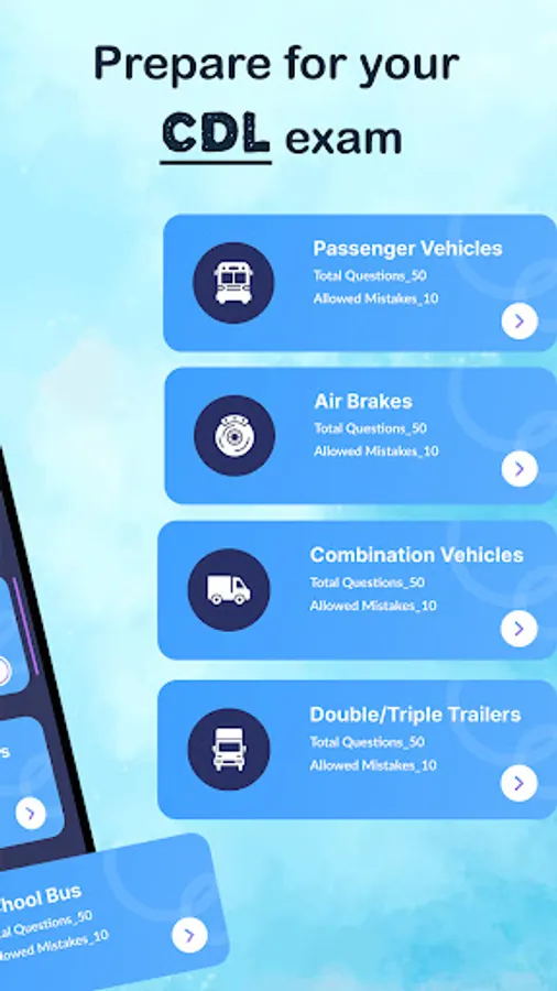 You can prepare for the commercial driver's license (CDL) exam for Class A, B, or C. DMV CDL test gives different question sets for the respected selected US states. It will be multiple option-based questions. Select the right option as the answer.
