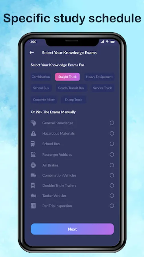 - Select the exam from the combination, concrete maker, school bus, straight truck, service truck, dump truck, heavy equipment, and coach/transit bus.
